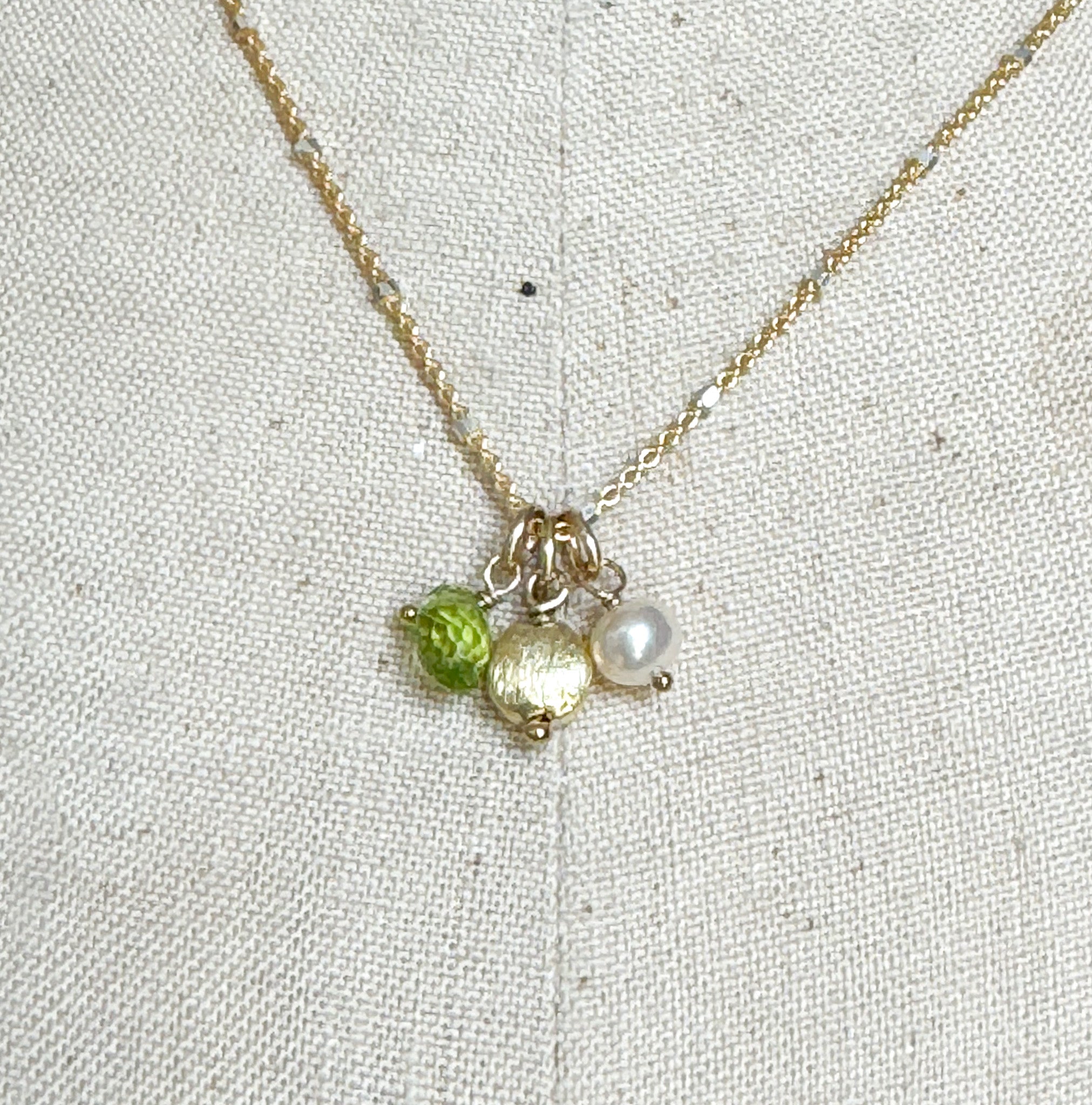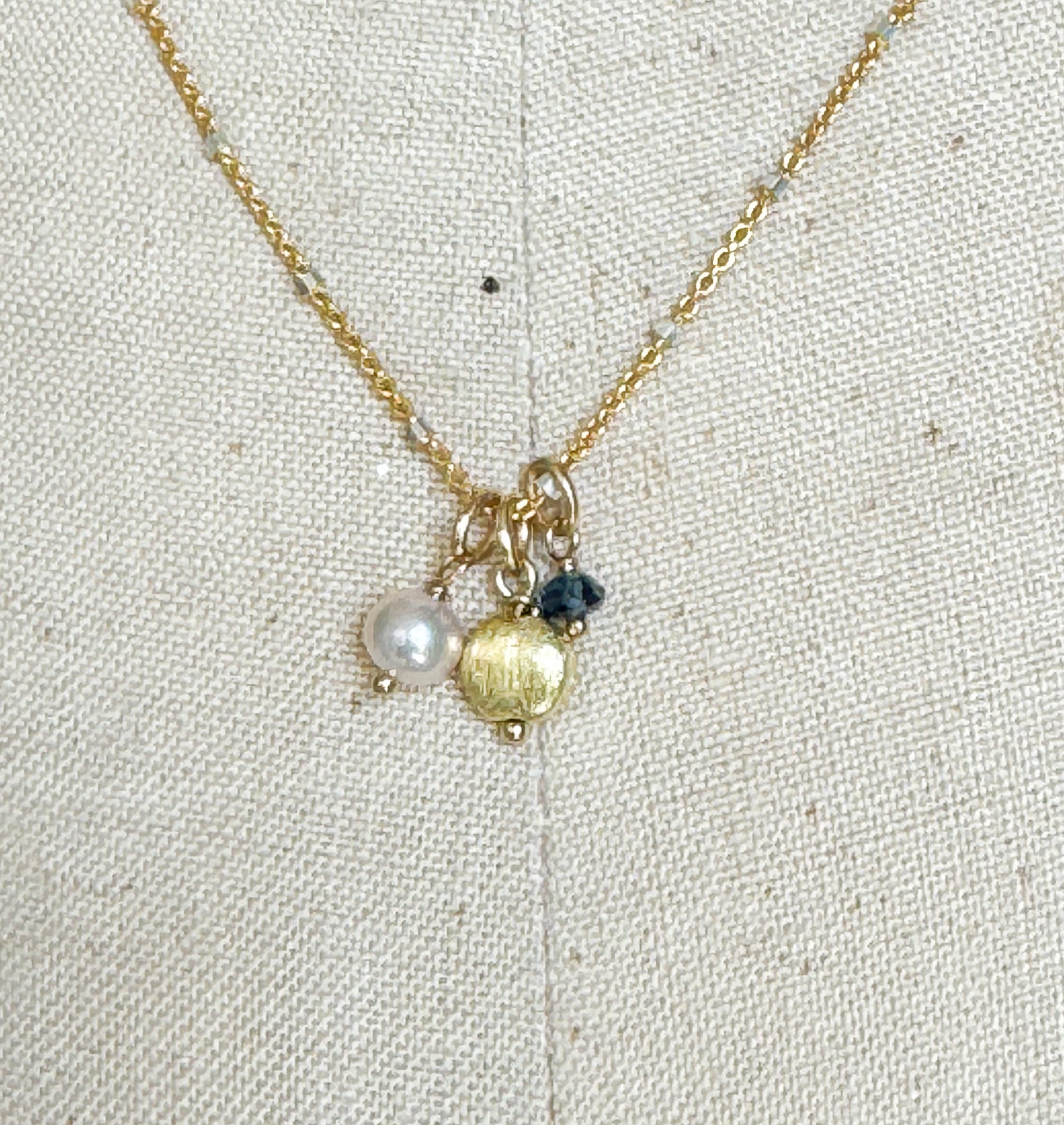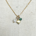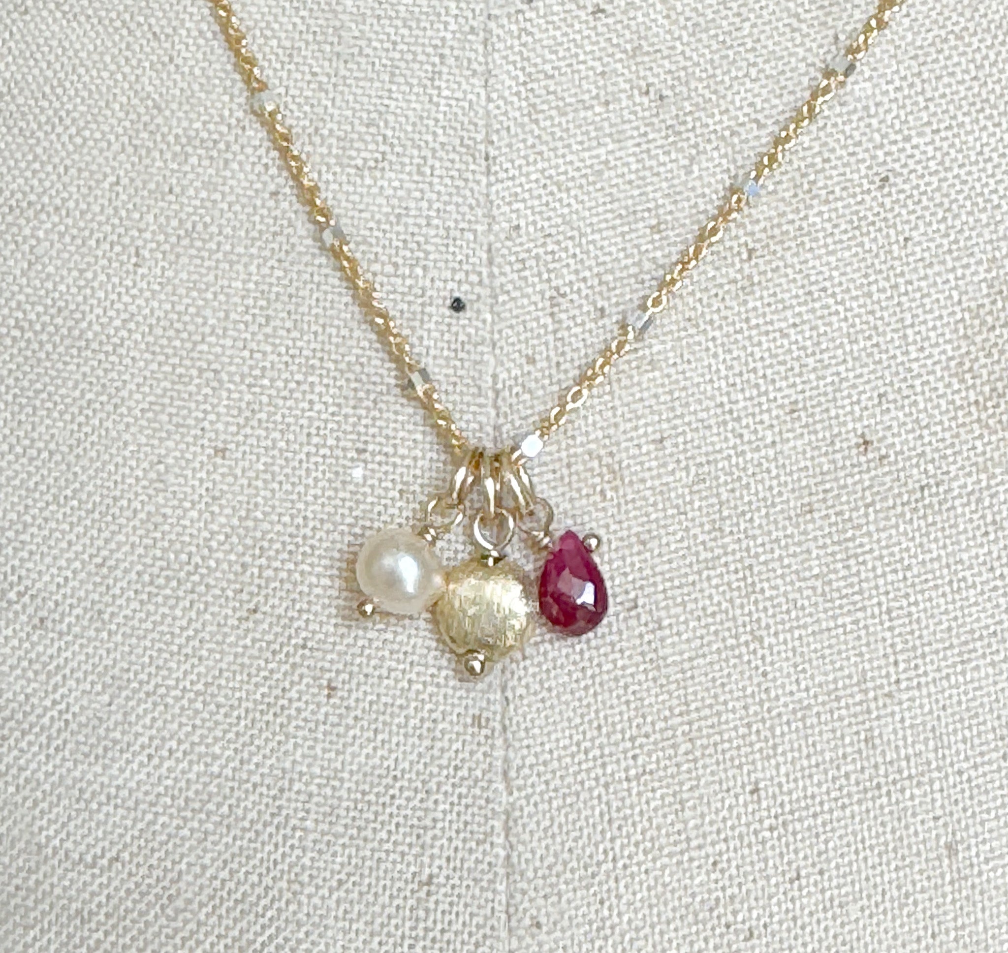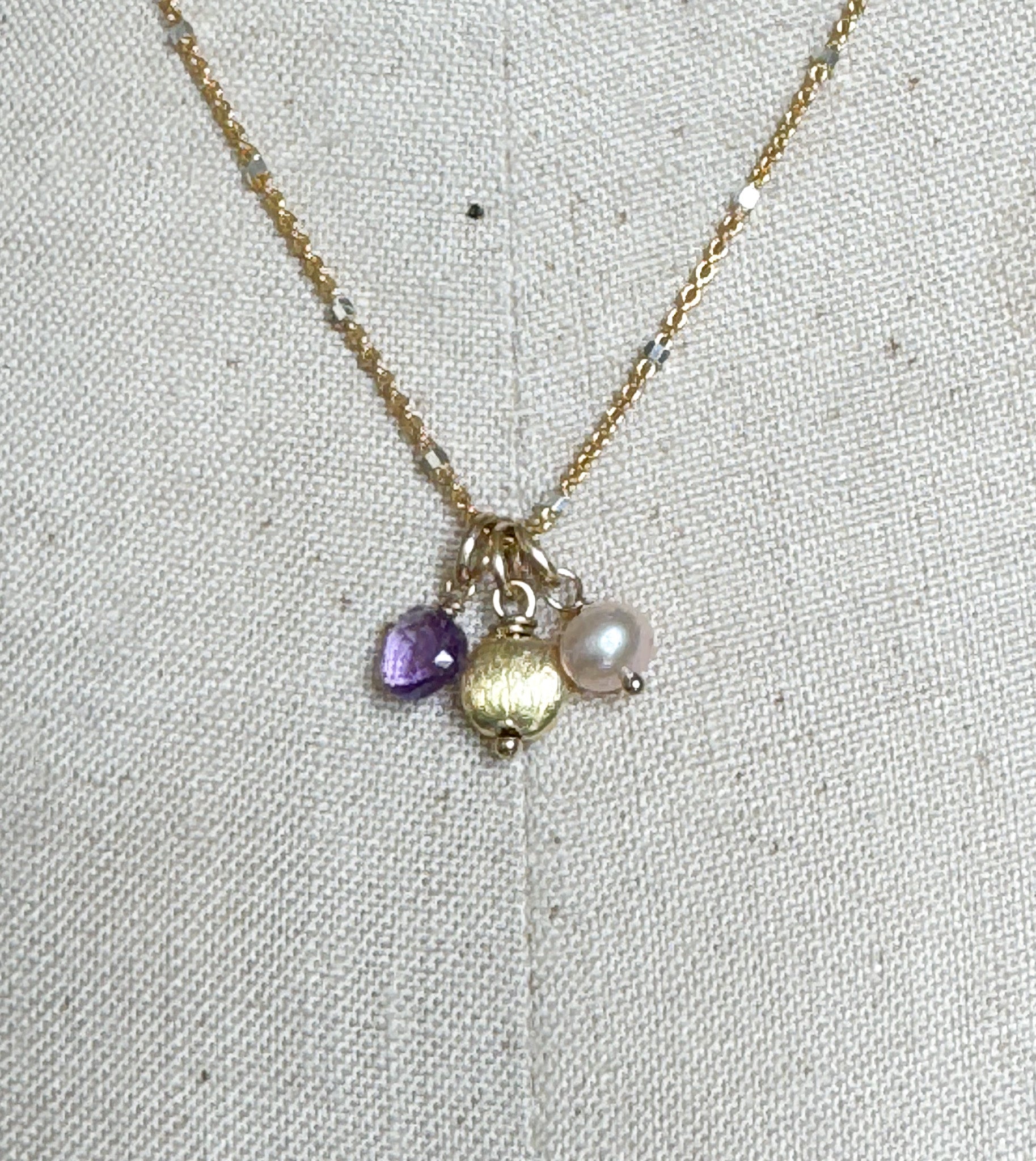The perfect gift for any month of the year. Our signature 3 charm necklace is both gold filled, gold vermeil and a semi precious gemstone. The chain is 18" and is adjustable.