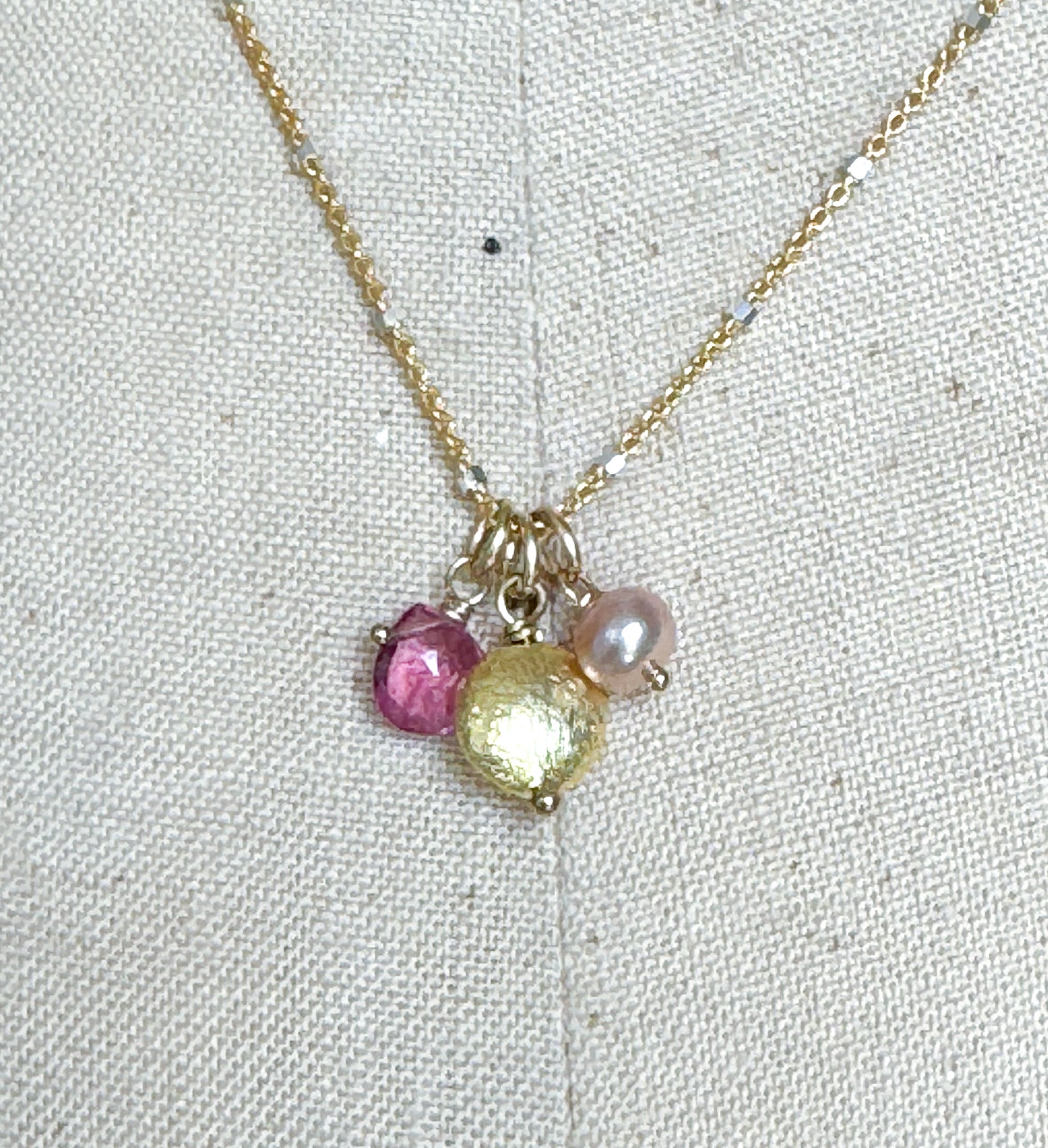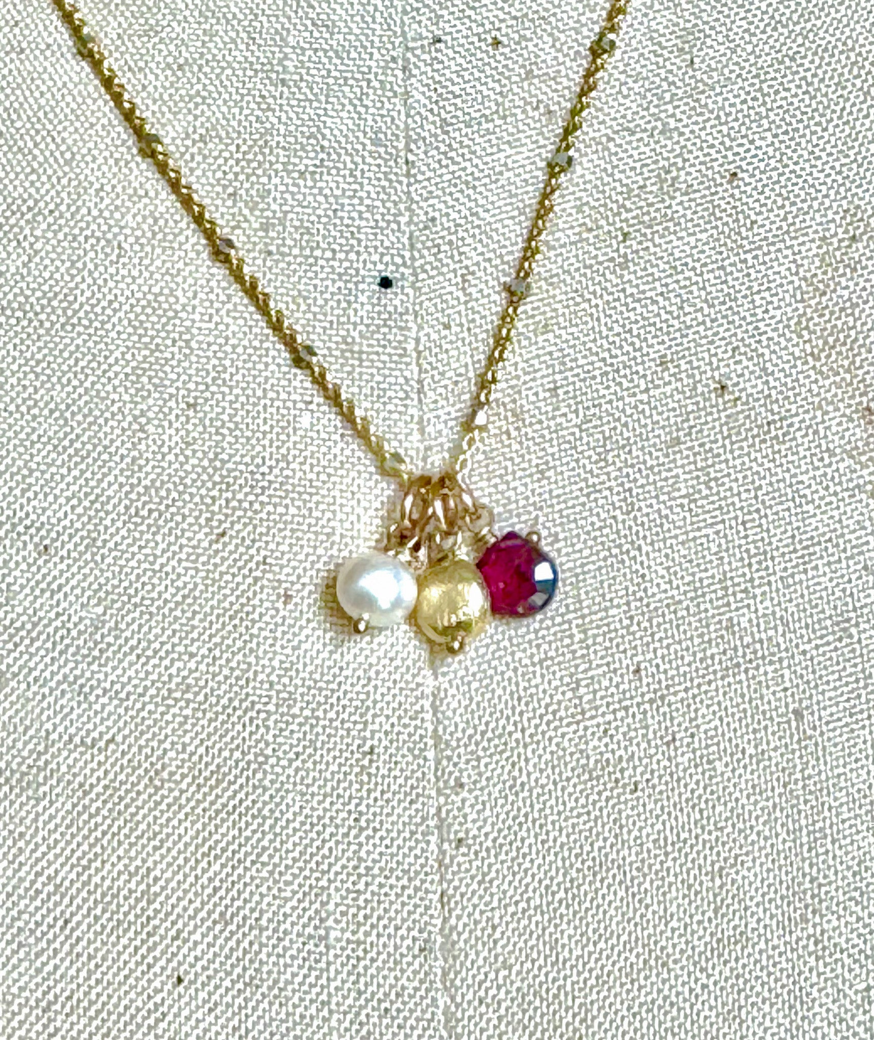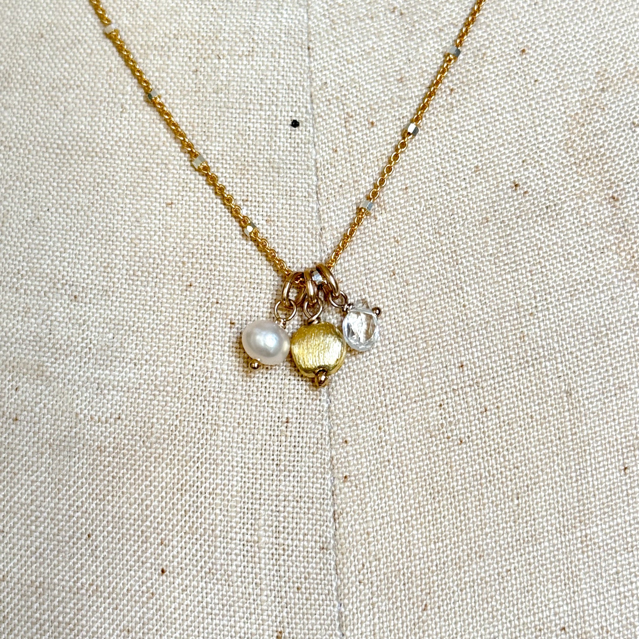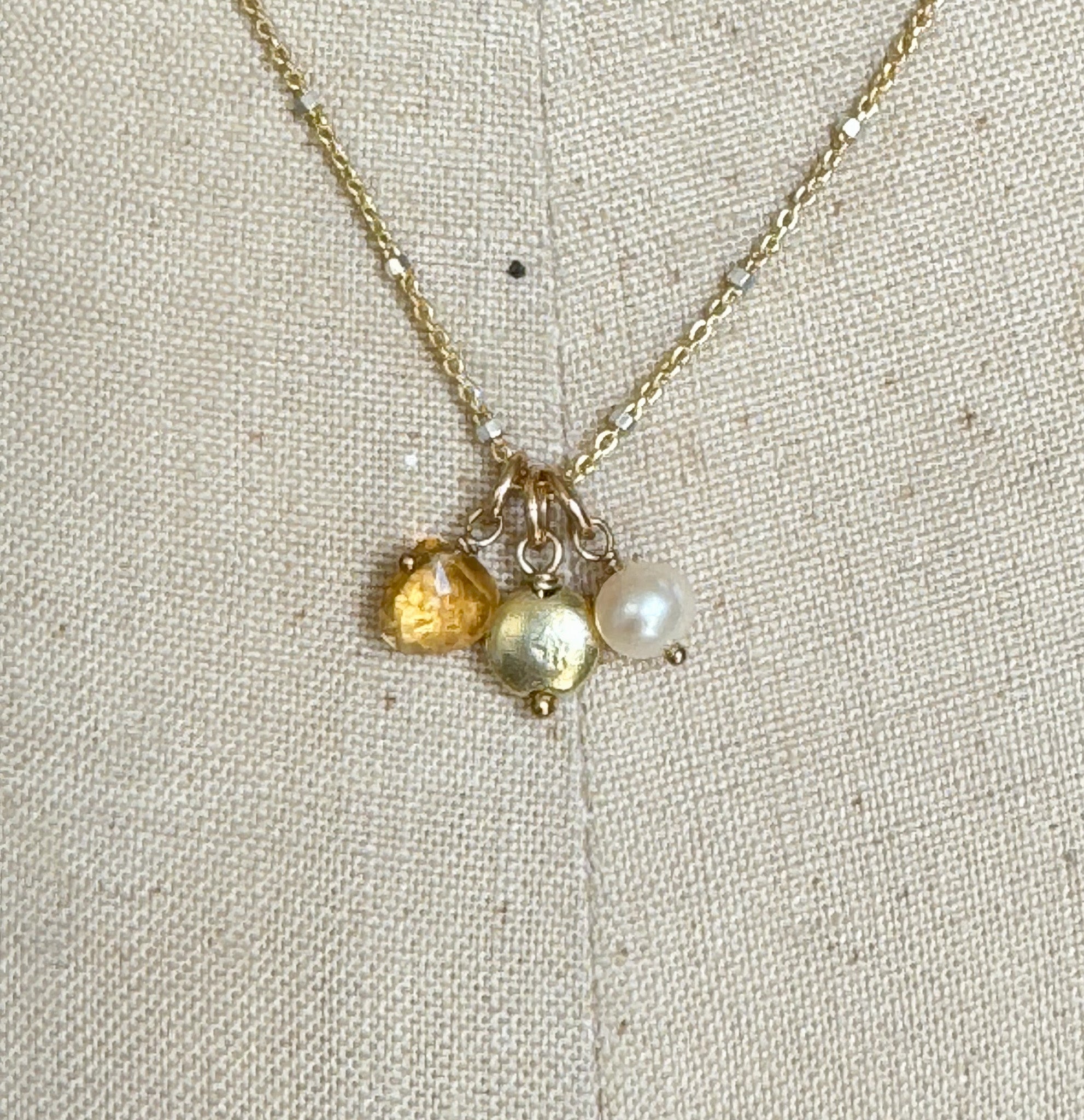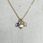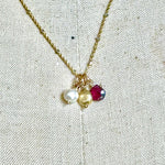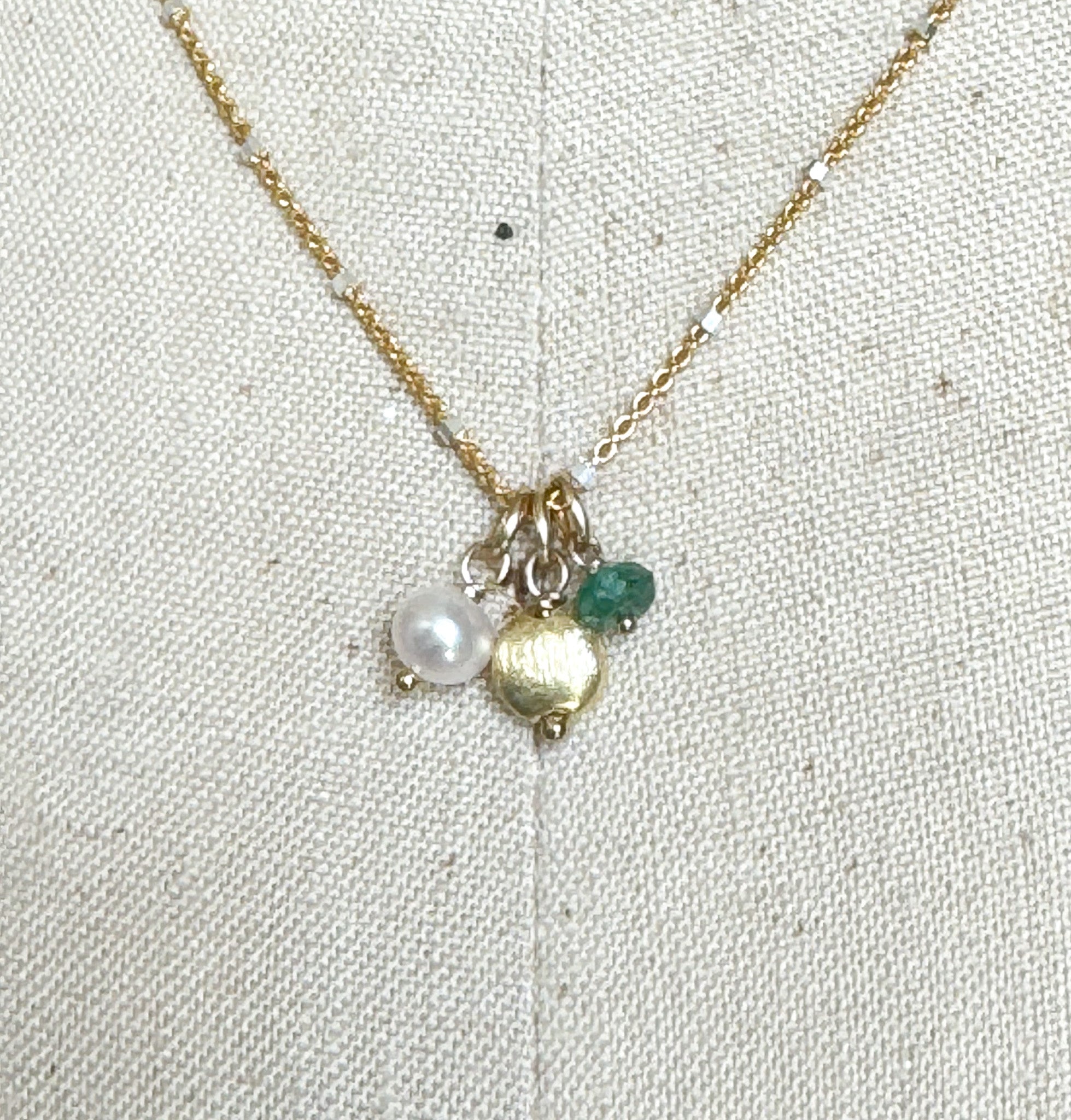 The perfect gift for any month of the year. Our signature 3 charm necklace is both gold filled, gold vermeil and a semi precious gemstone. The chain is 18" and is adjustable.