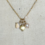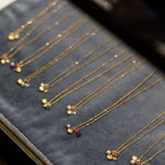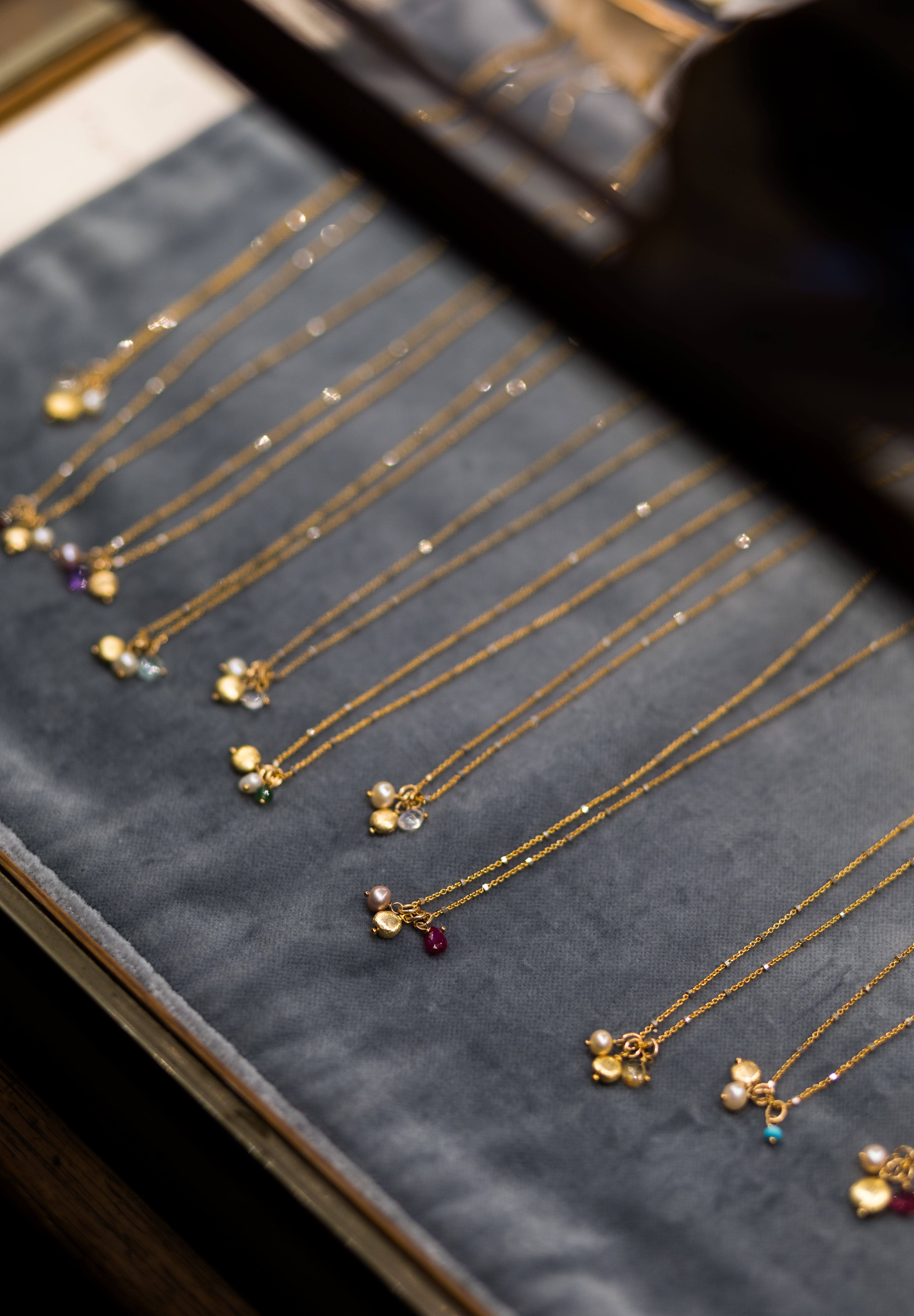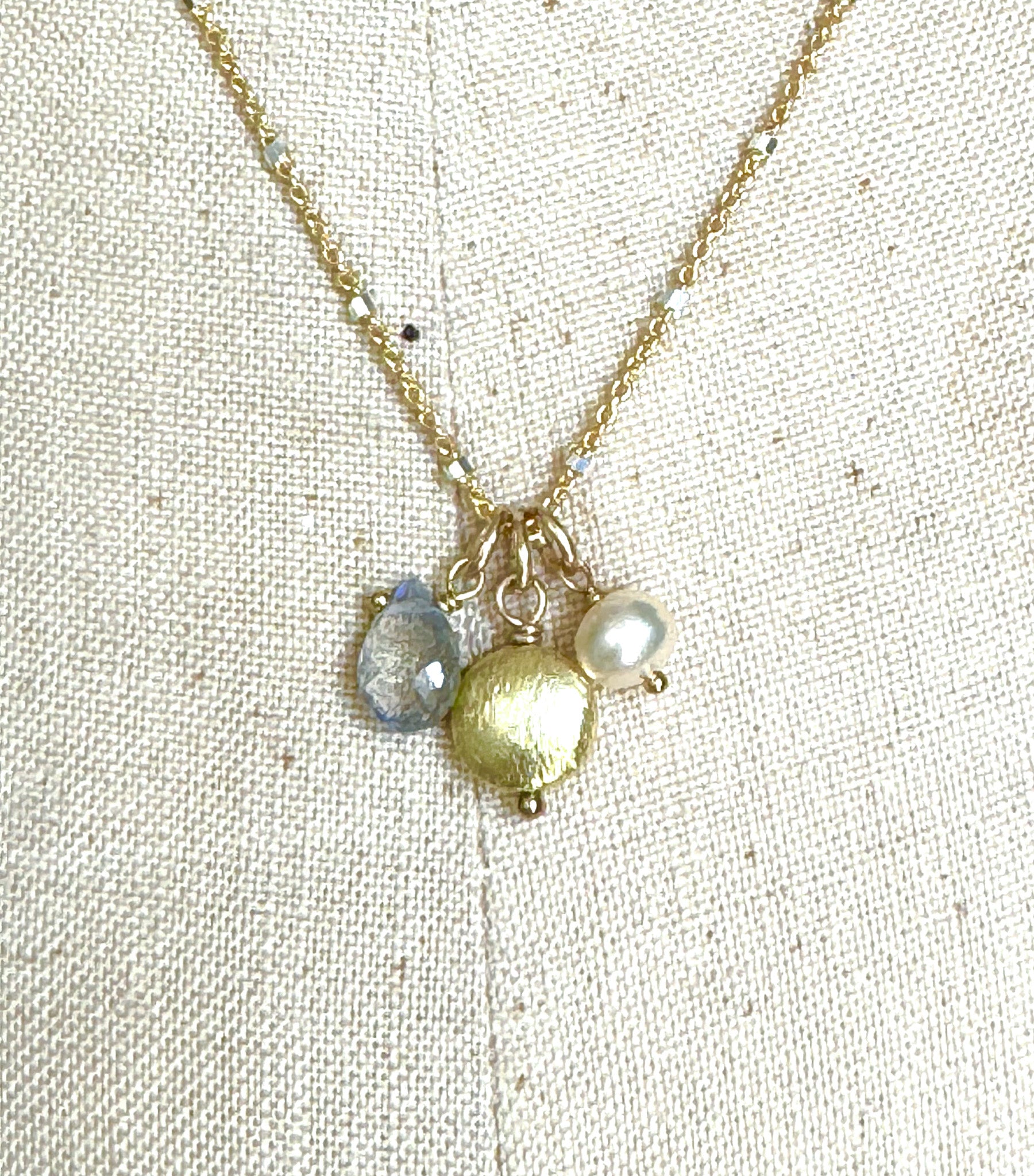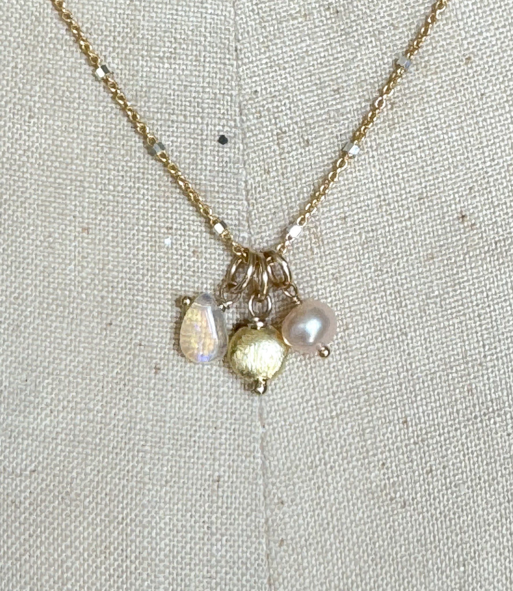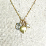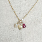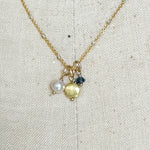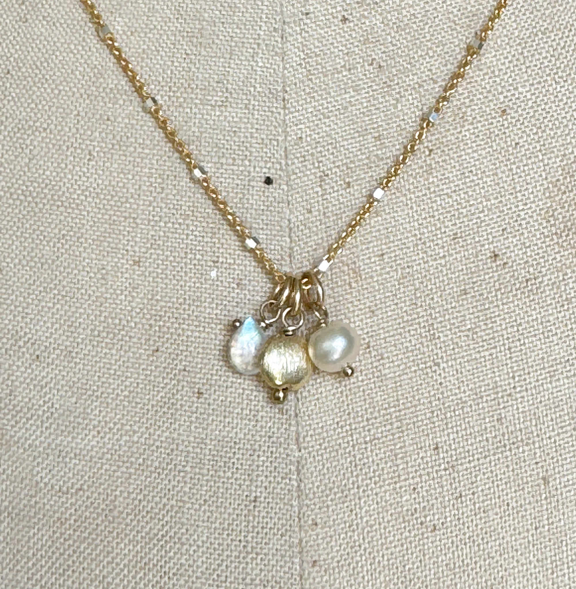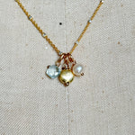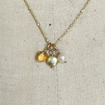 The perfect gift for any month of the year. Our signature 3 charm necklace is both gold filled, gold vermeil and a semi precious gemstone. The chain is 18" and is adjustable.