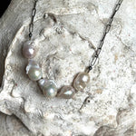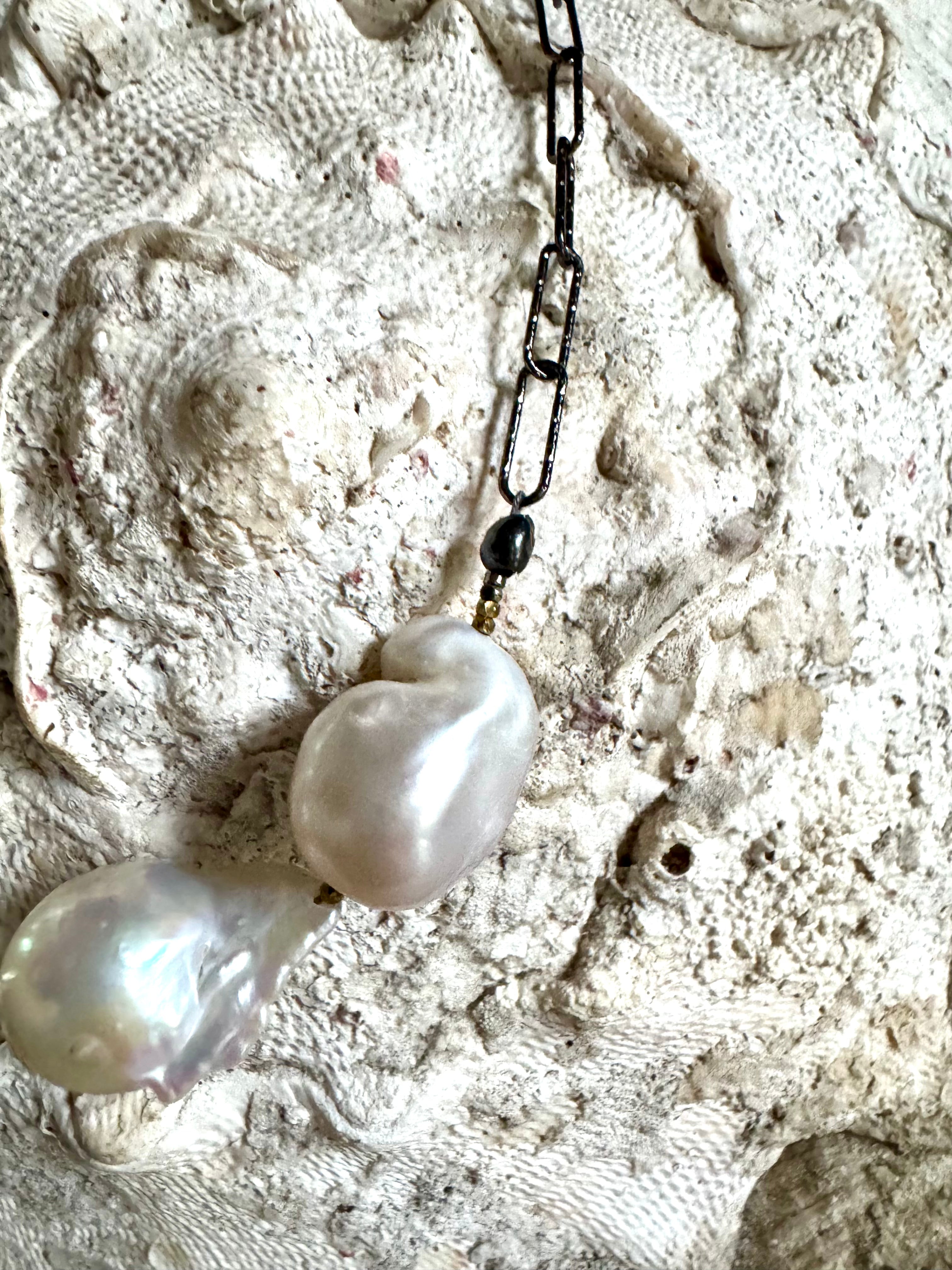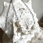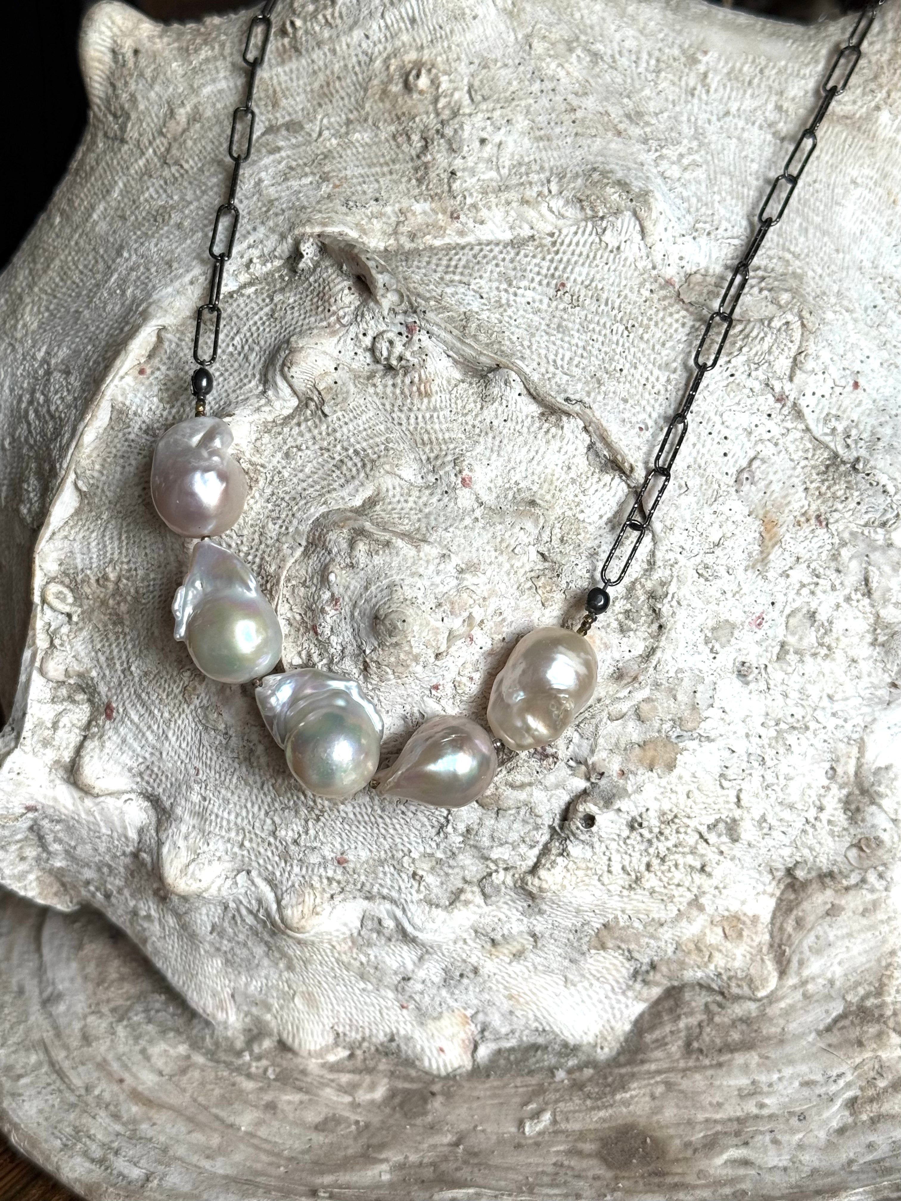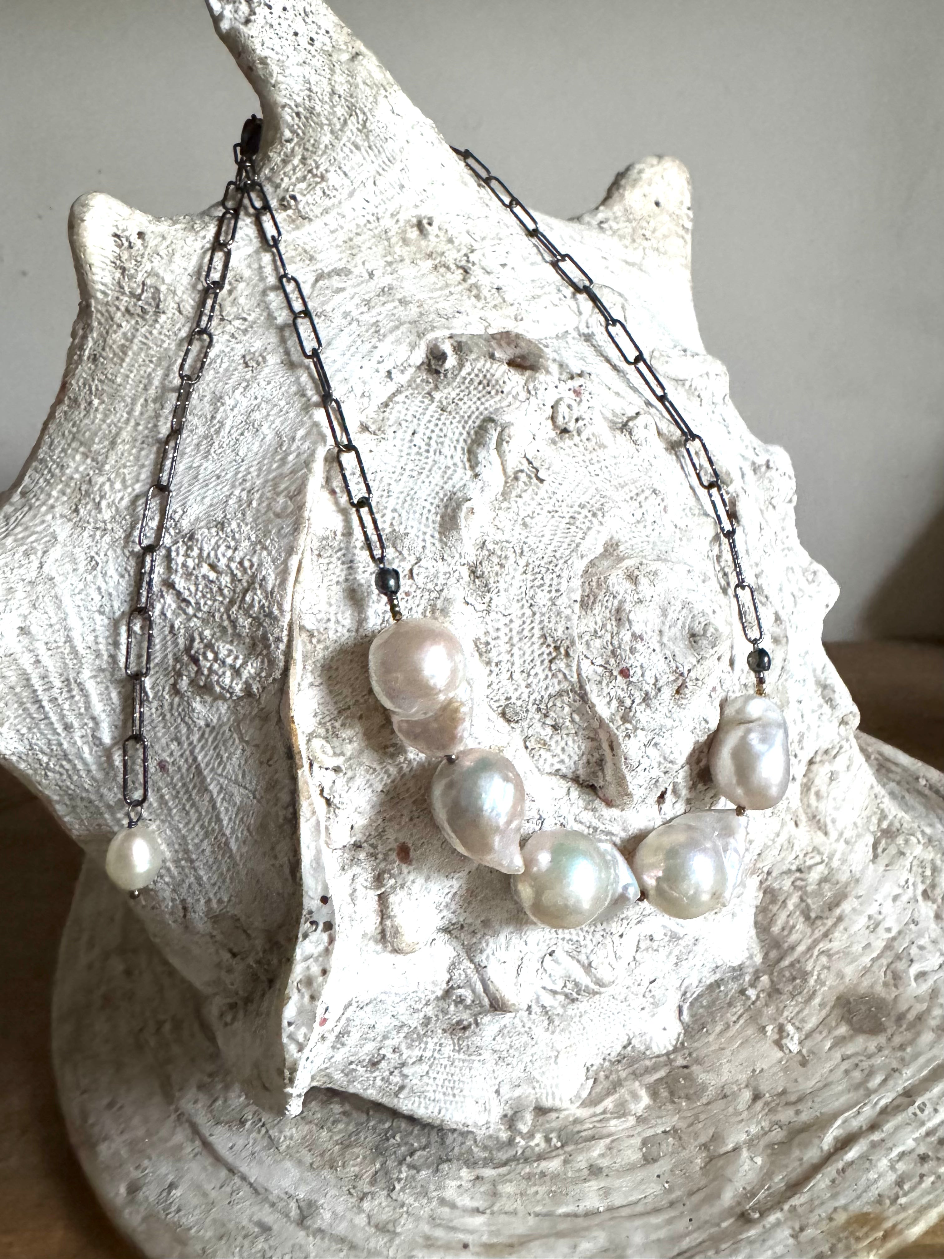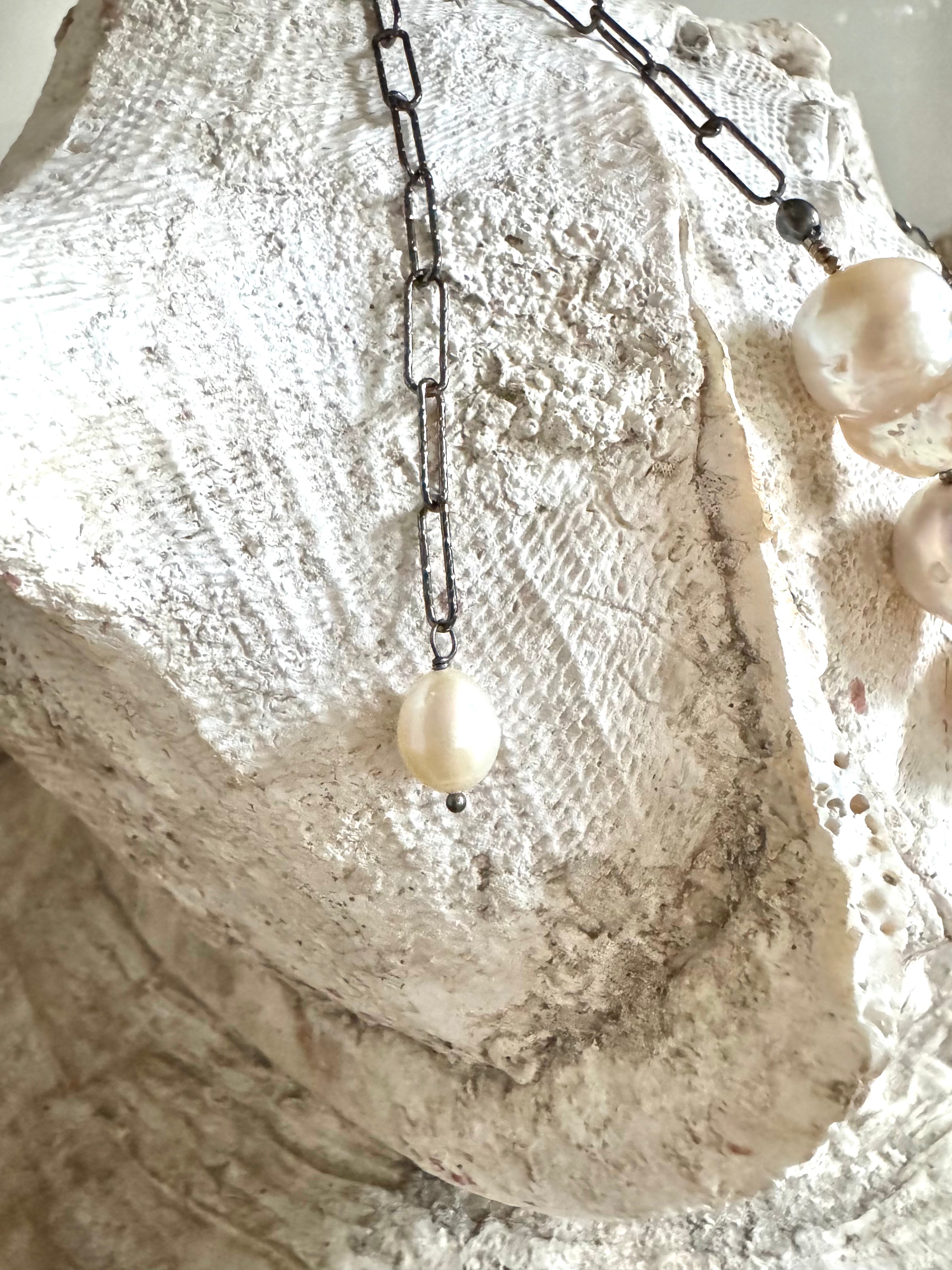 A stunning strand of hand-selected baroque pearls, each one uniquely sculpted by the sea. Suspended from an oxidized sterling silver paper-clip chain, this 20” necklace blends old-world romance with modern edge and equally chic layered or worn on its own.