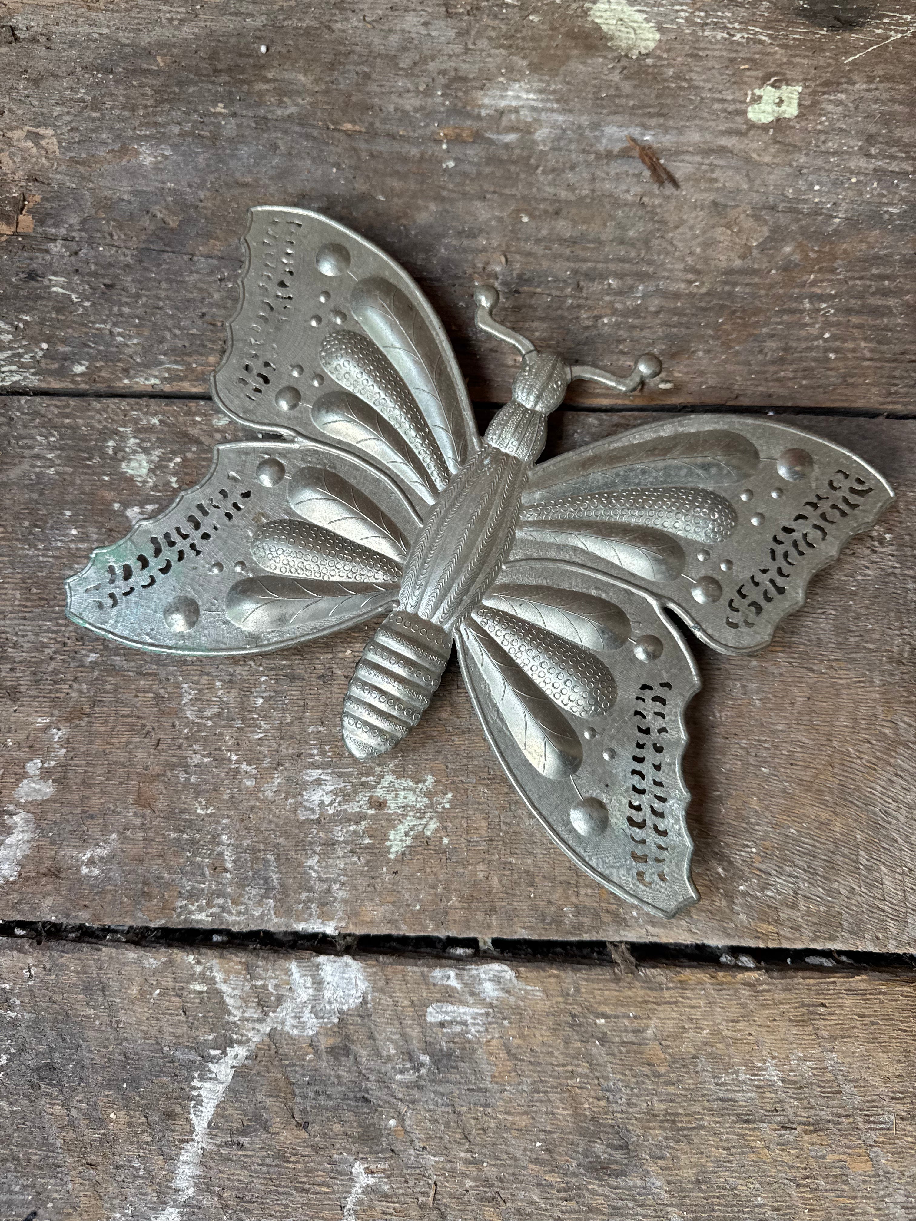 French butterfly trivet crafted in cast metal with intricate detail and aged patina. A functional and decorative piece, perfect for protecting tabletops or adding whimsical French country style to your kitchen décor.