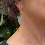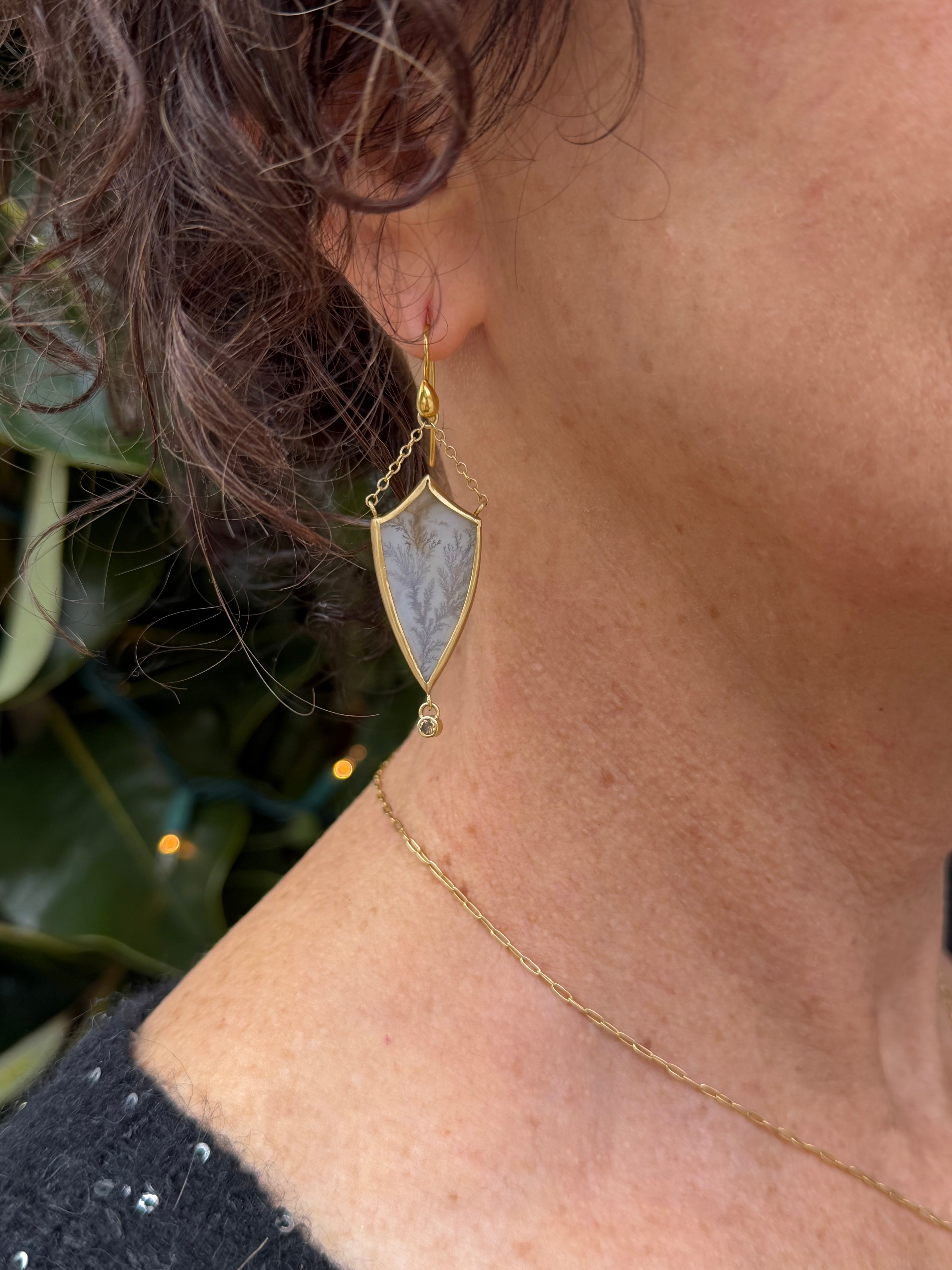 Framed in 18k gold, these shield-shaped earrings feature mesmerizing dendritic agate. Each stone revealing delicate, fern-like patterns formed by nature. A single cognac diamond drop adds a touch of earthy brilliance, complementing the gold’s warmth and the stone’s ethereal beauty. Elegant, organic, and timeless — true wearable art.