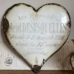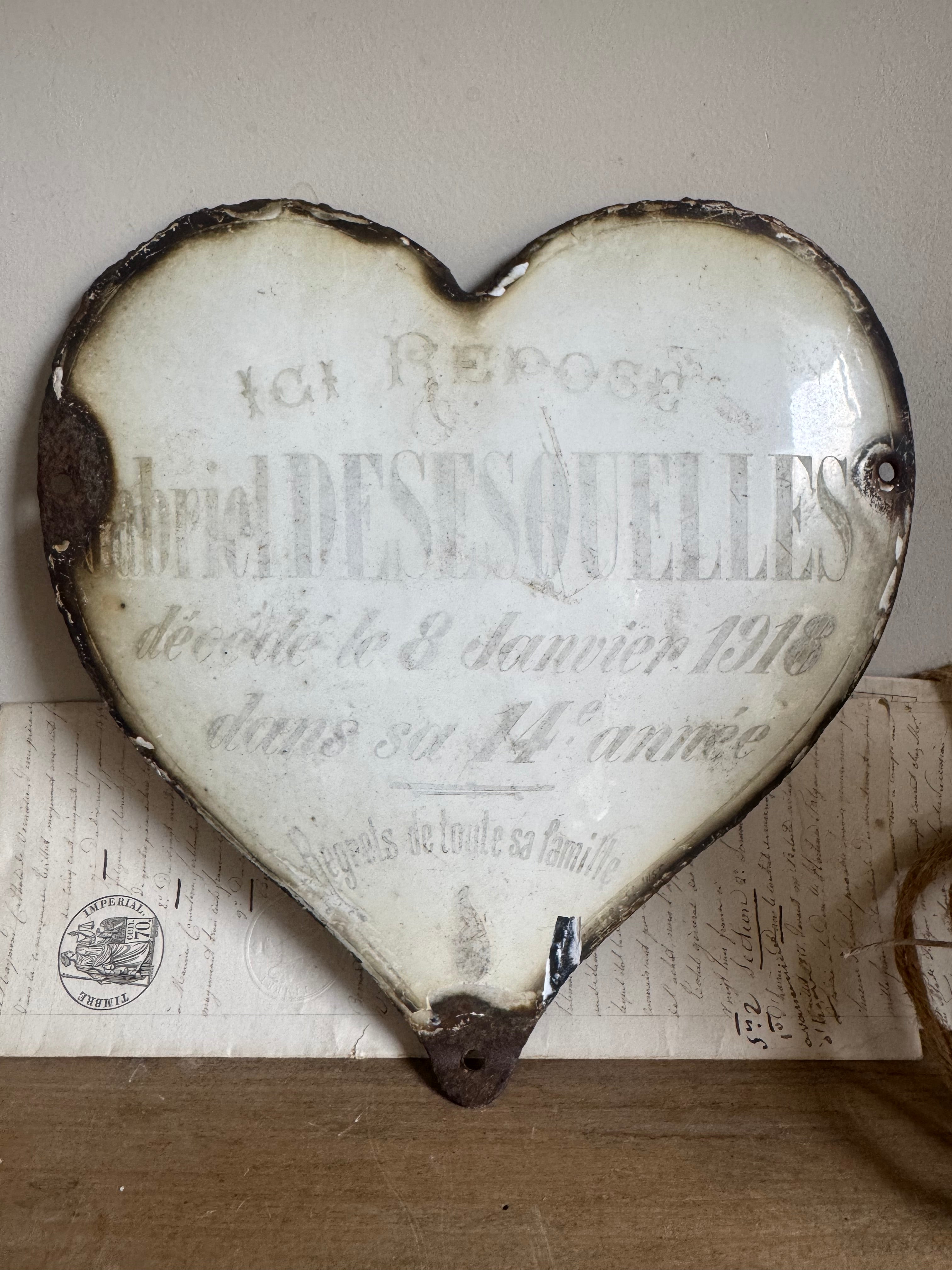 These vintage French enamel hearts, originally from a cemetery, carries a deep sense of history and sentiment. Traditionally used as a memorial marker, it features a beautifully aged patina with intricate detailing that speaks to the craftsmanship of the time. Perfect for collectors or those seeking a unique piece with a story, this heart will bring a touch of French heritage and rustic elegance to any space. Ideal for display in gardens, homes, or as part of a curated collection of antiques.