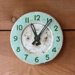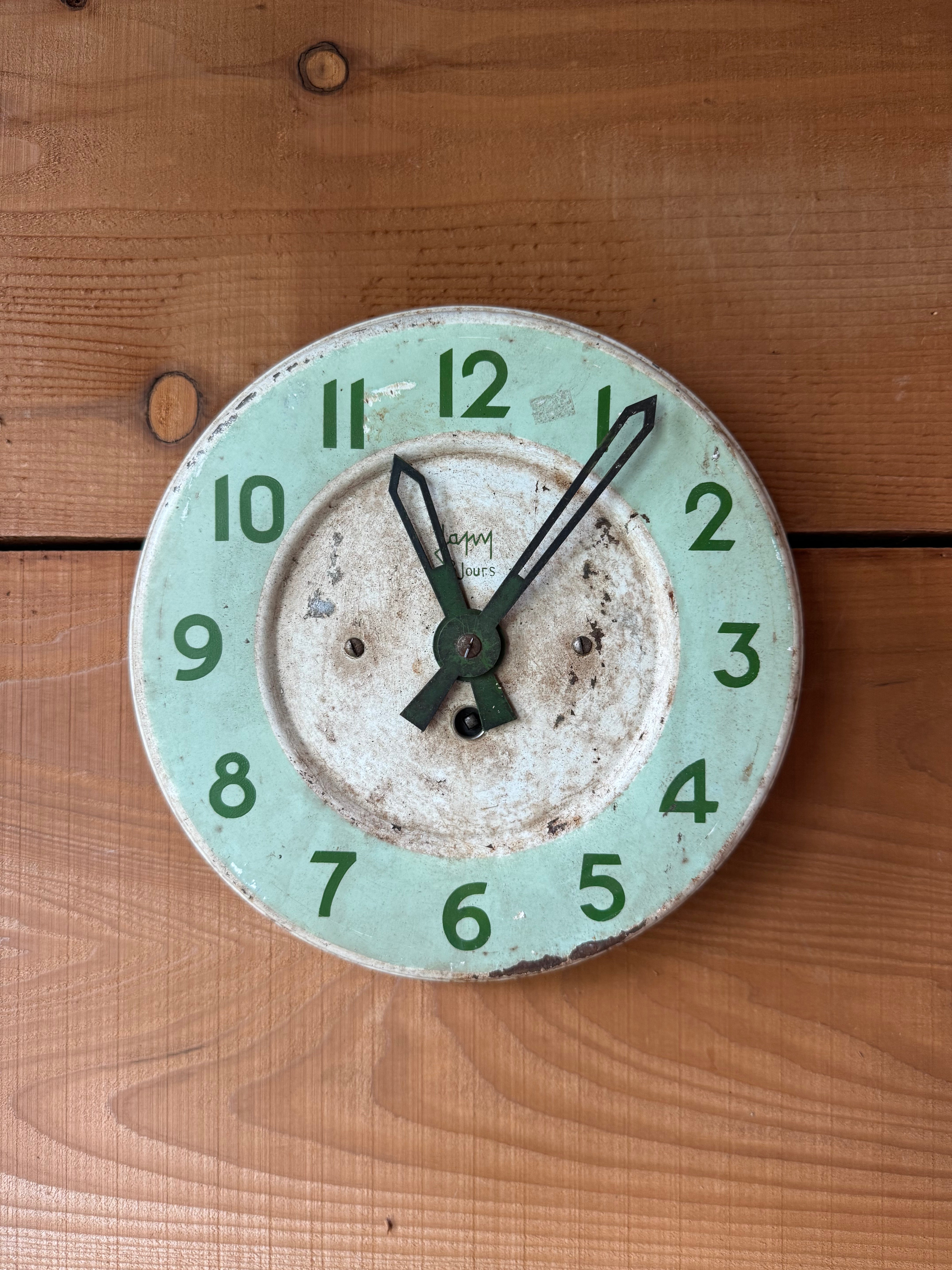 French vintage wall clock with green enamel numbers and hands, showing beautiful aged patina. A bold decorative accent that captures rustic French charm, perfect for kitchens, cafes, or farmhouse interiors.