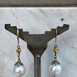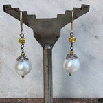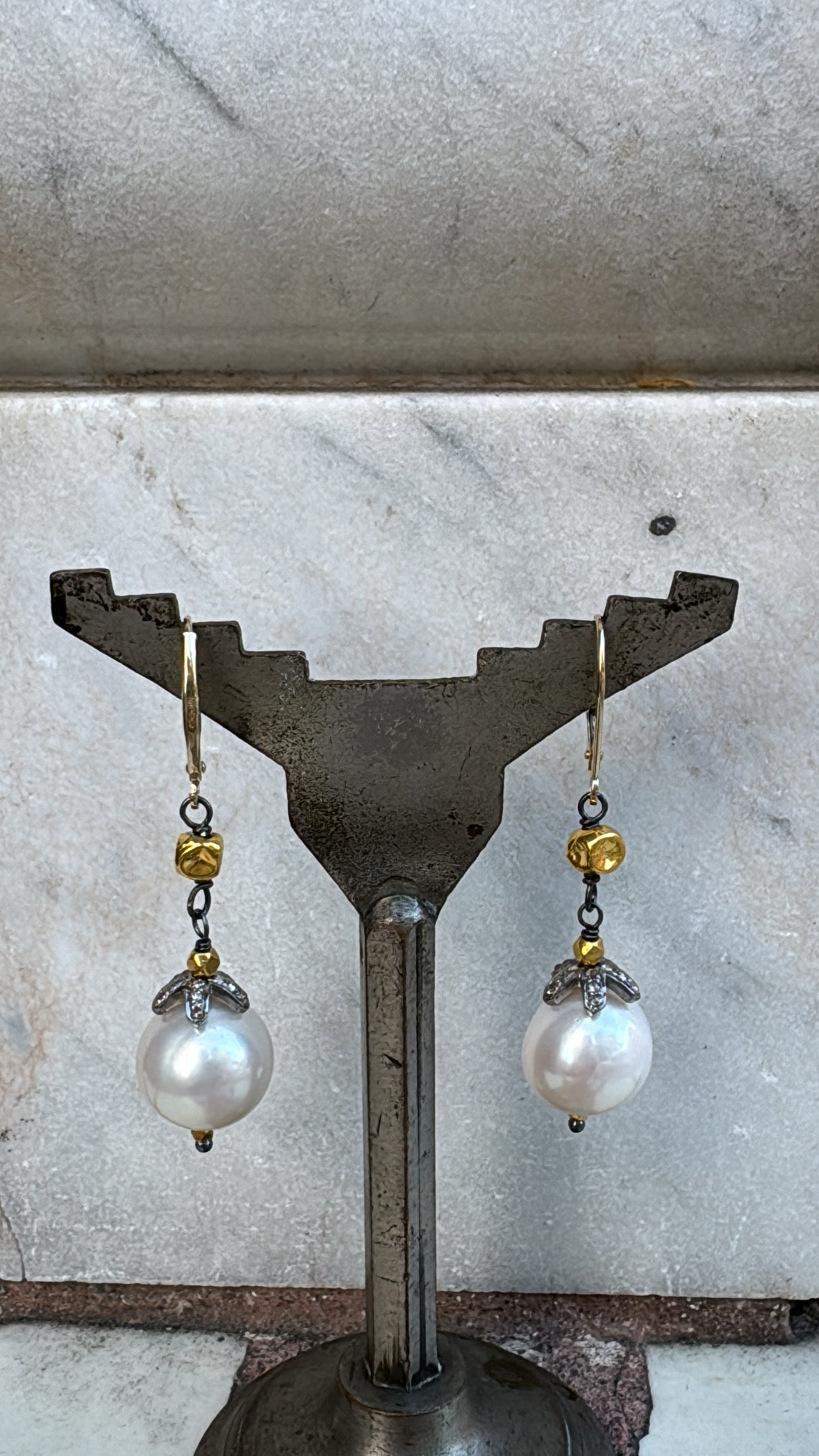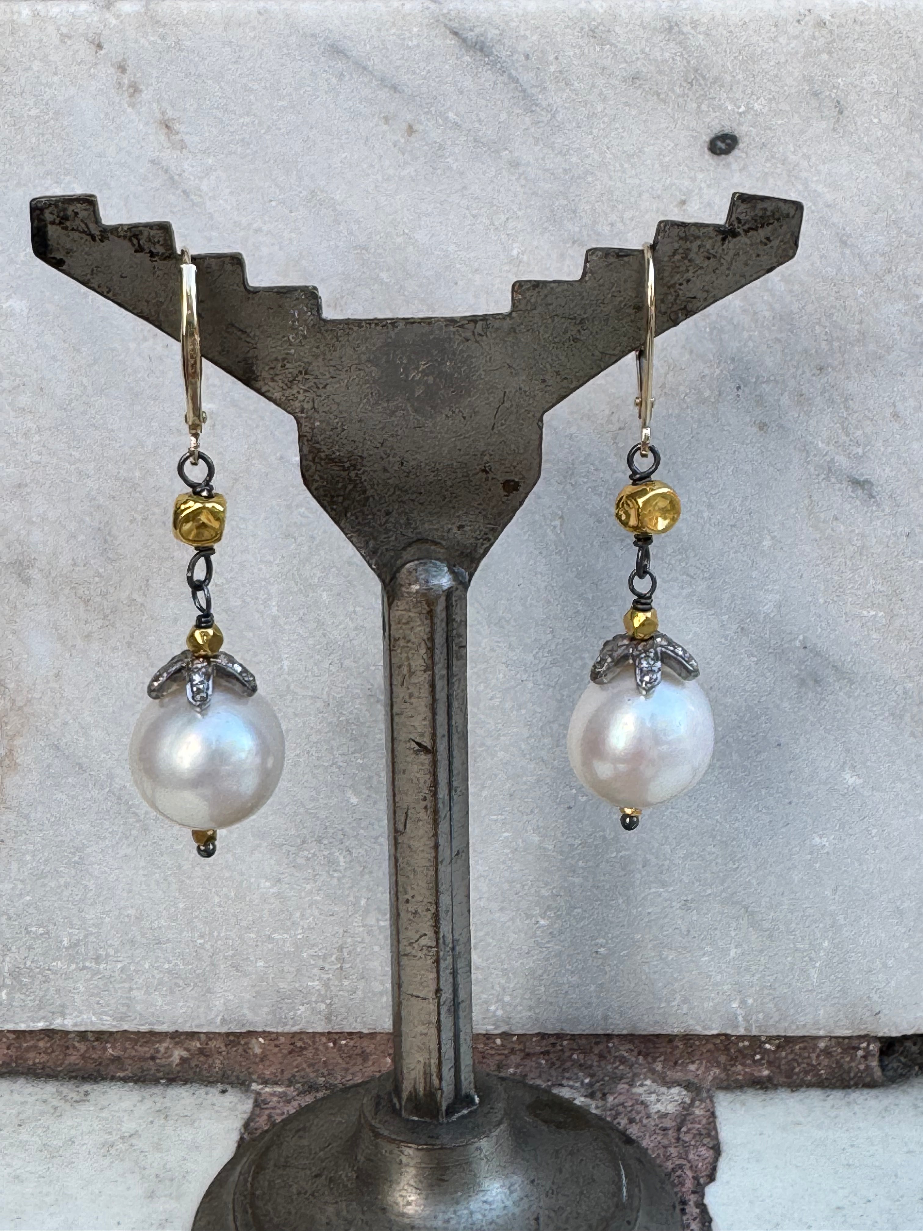 Elegant drop earrings featuring luminous baroque pearls topped with petite diamond style accents and gold-tone 18k nuggets. Suspended from simple metal hooks, they blend rustic charm with refined sparkle — a timeless, French-inspired look