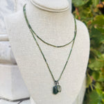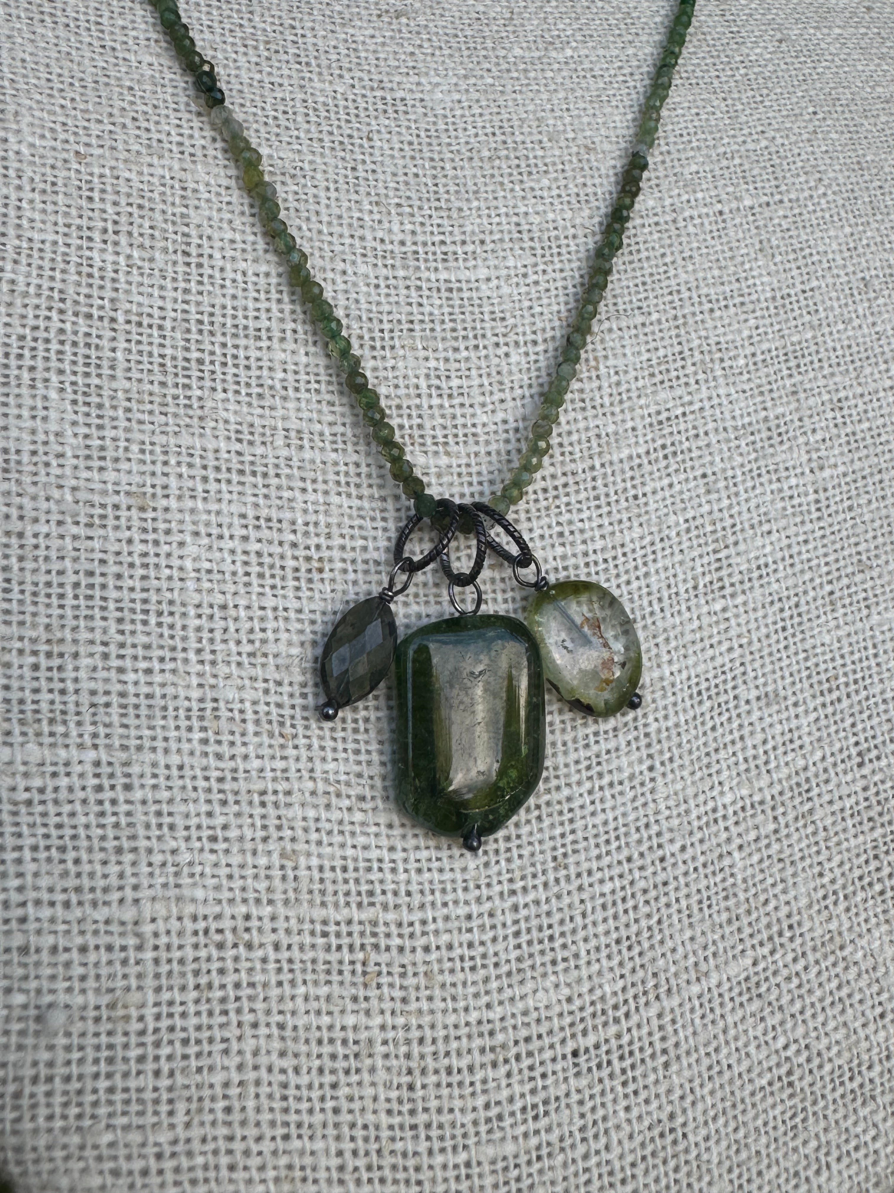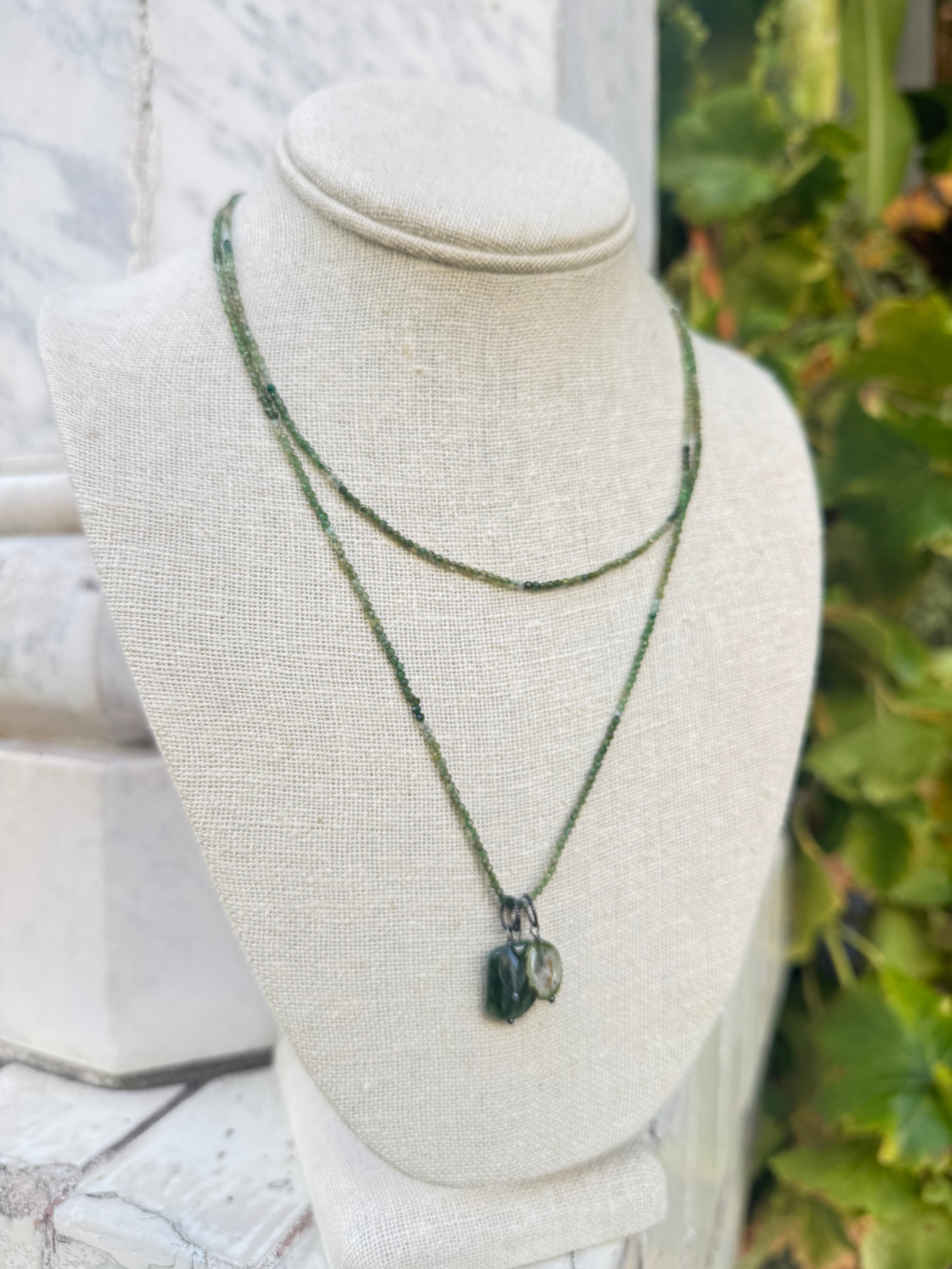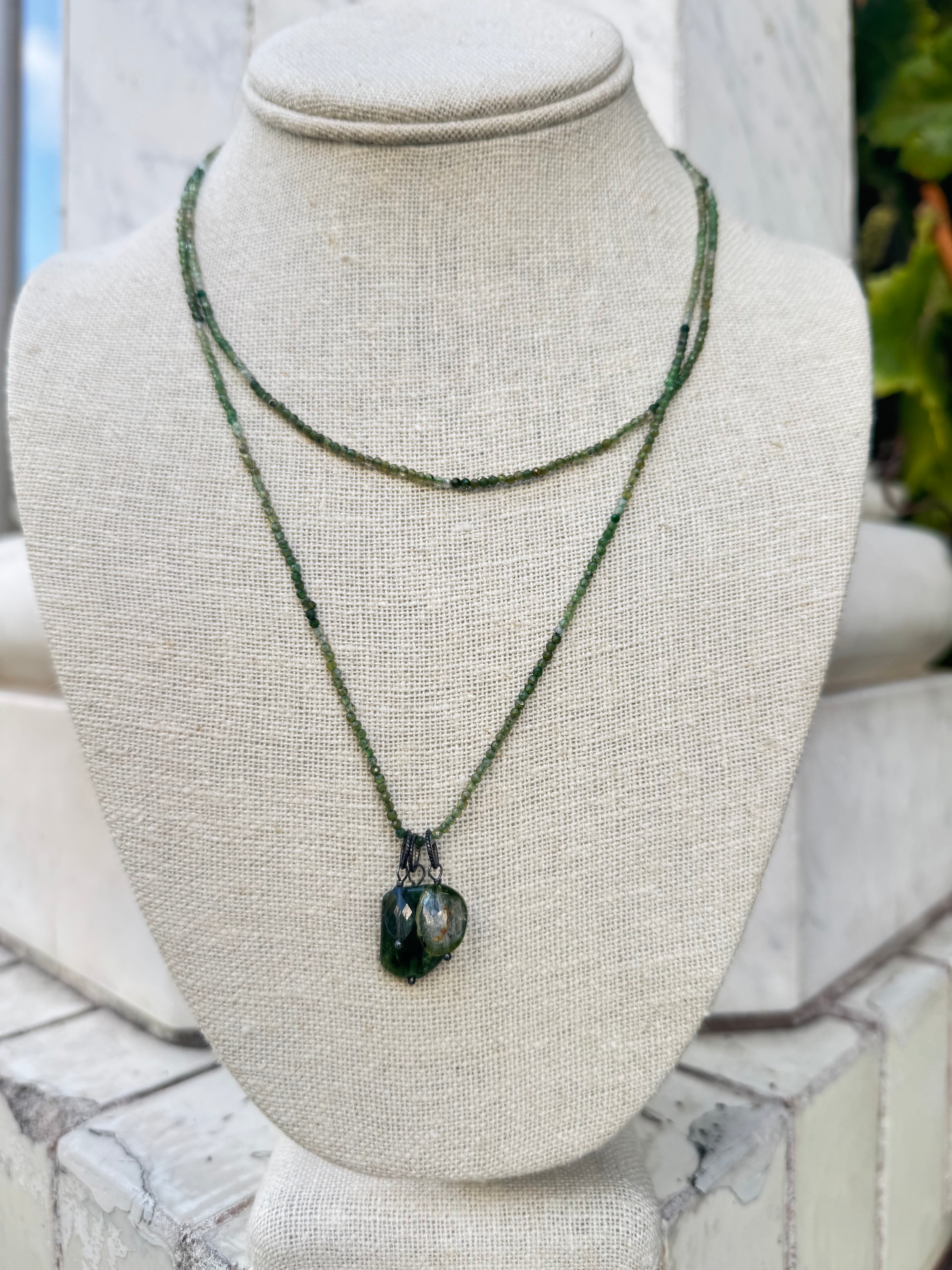 A timeless strand of natural beauty, this necklace features 36 inches of faceted green tourmaline beads, each reflecting the stone’s luminous depth and vibrant energy. Three delicate green tourmaline drops add movement and elegance, while a sterling silver clasp provides a refined finish. Versatile and sophisticated, it can be worn long, doubled for a layered look, or styled as a statement piece.