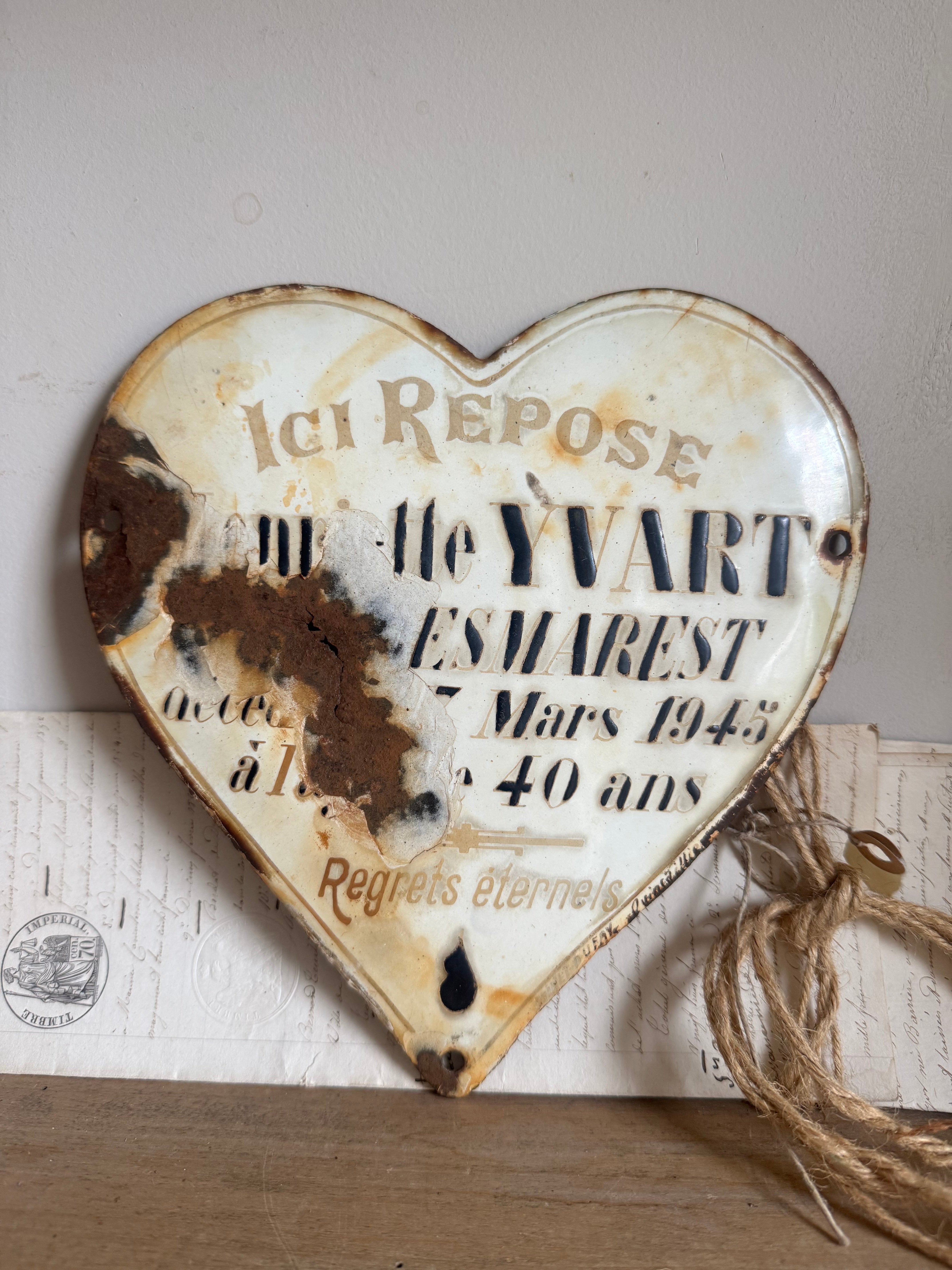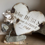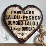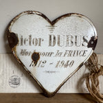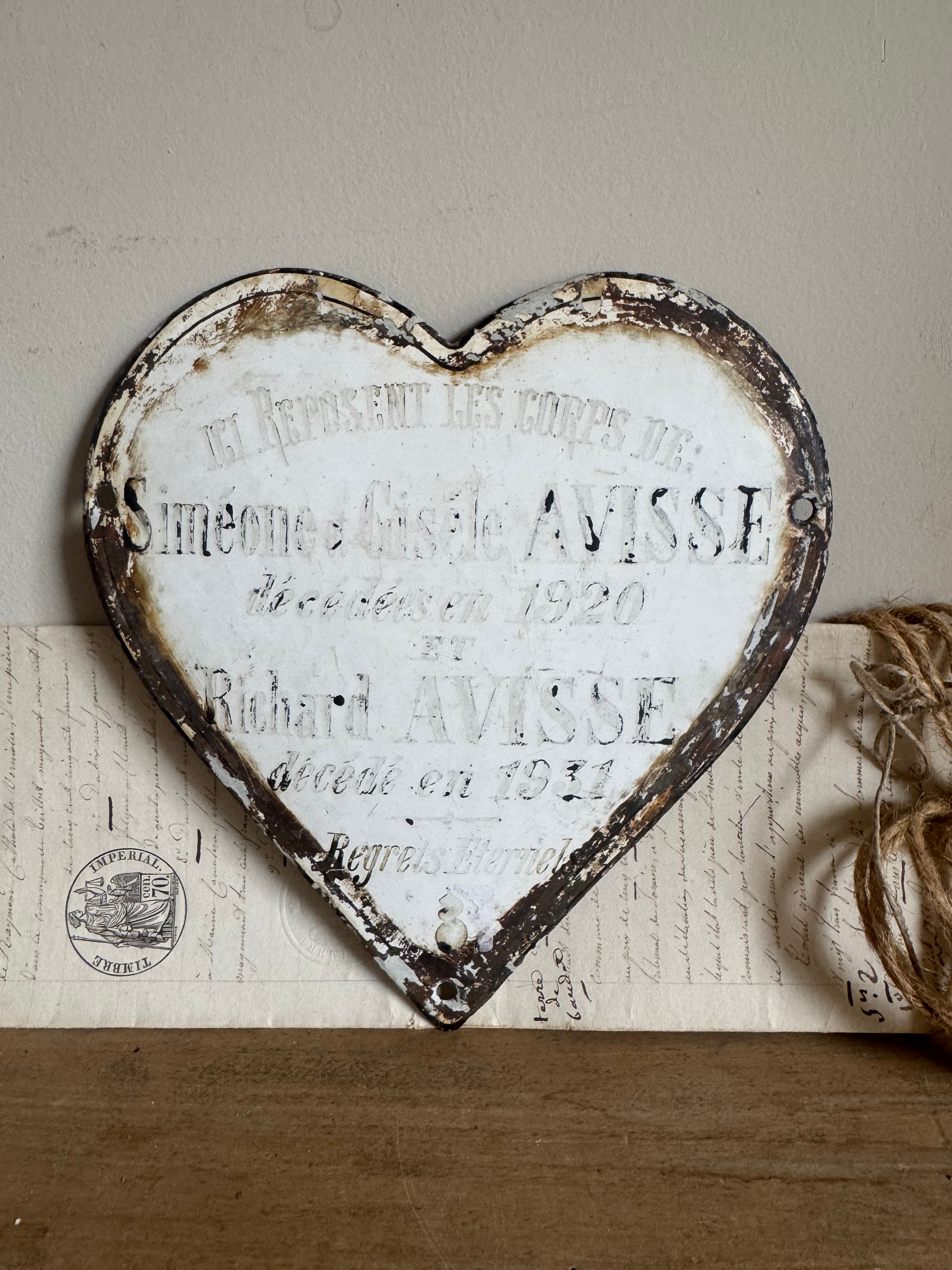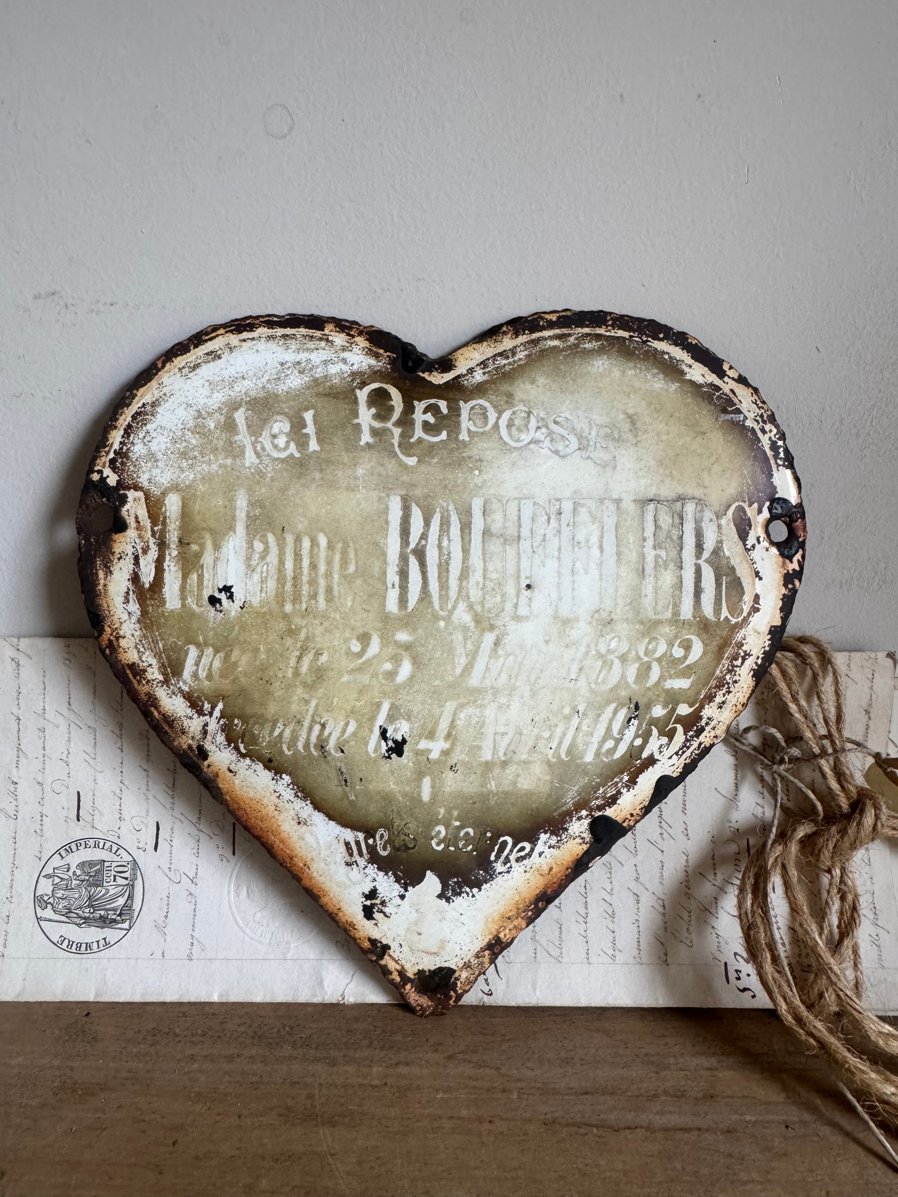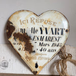 These vintage French enamel hearts, originally from a cemetery, carries a deep sense of history and sentiment. Traditionally used as a memorial marker, it features a beautifully aged patina with intricate detailing that speaks to the craftsmanship of the time. Perfect for collectors or those seeking a unique piece with a story, this heart will bring a touch of French heritage and rustic elegance to any space. Ideal for display in gardens, homes, or as part of a curated collection of antiques.