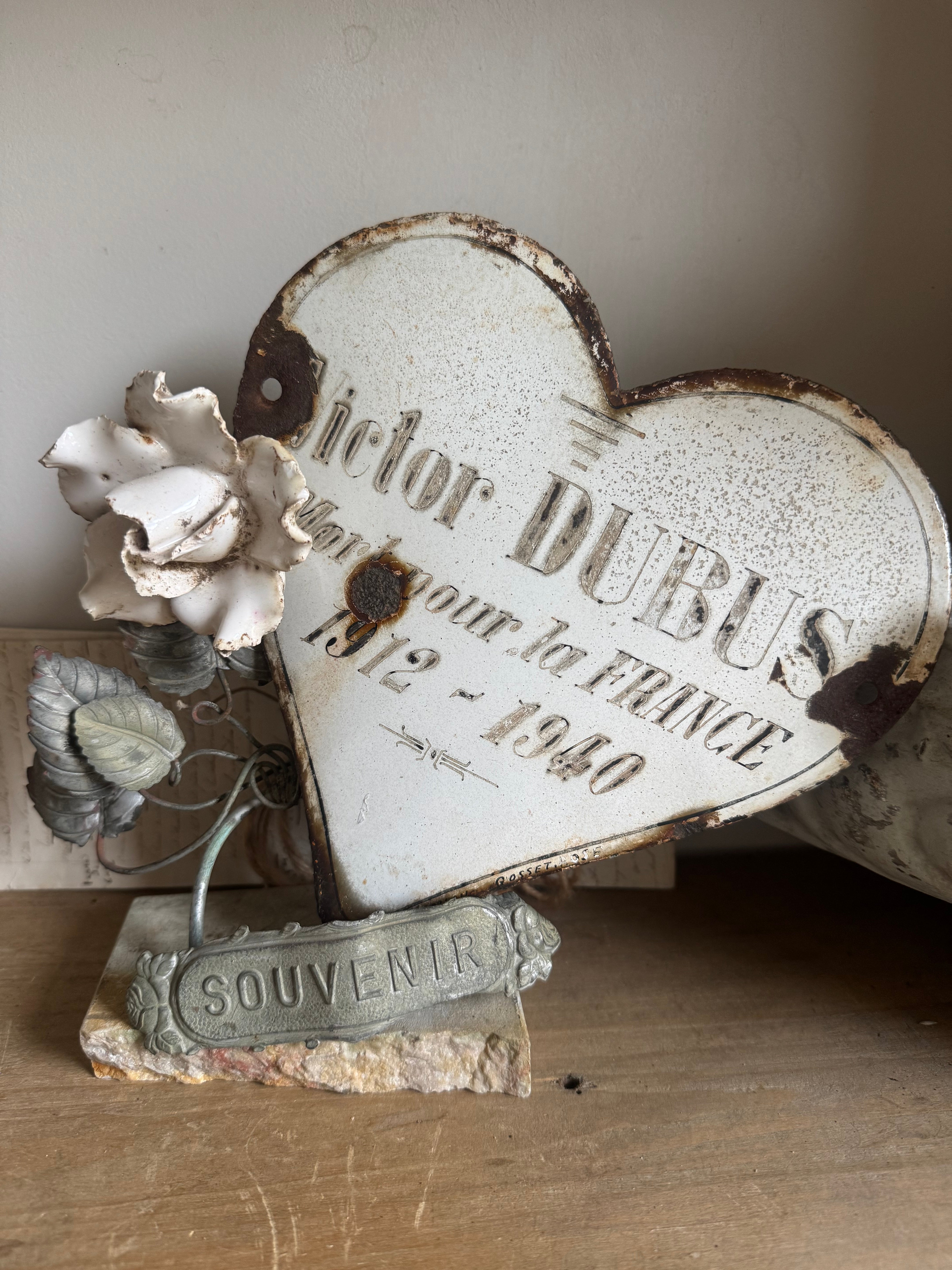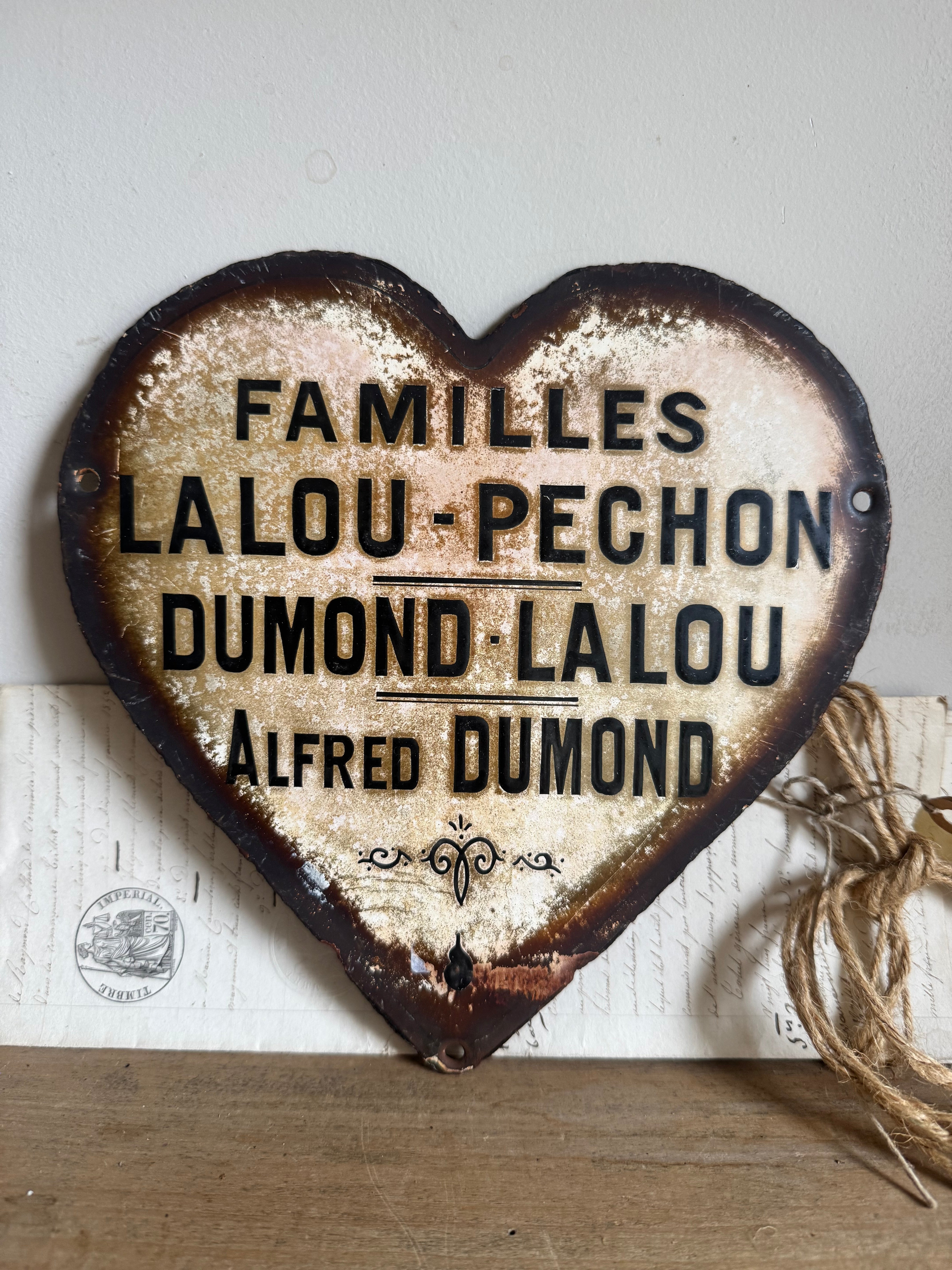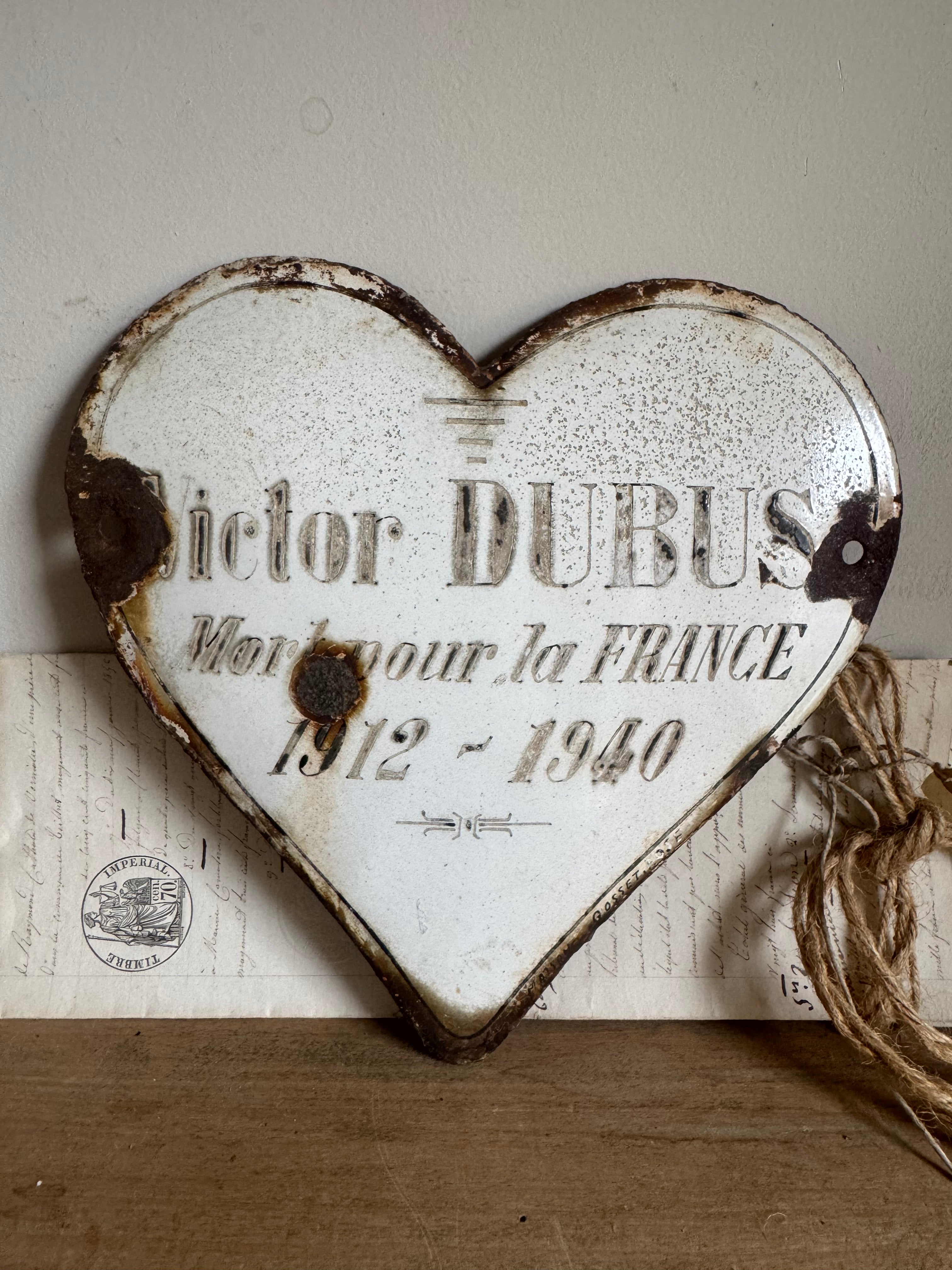 These vintage French enamel hearts, originally from a cemetery, carries a deep sense of history and sentiment. Traditionally used as a memorial marker, it features a beautifully aged patina with intricate detailing that speaks to the craftsmanship of the time. Perfect for collectors or those seeking a unique piece with a story, this heart will bring a touch of French heritage and rustic elegance to any space. Ideal for display in gardens, homes, or as part of a curated collection of antiques.