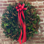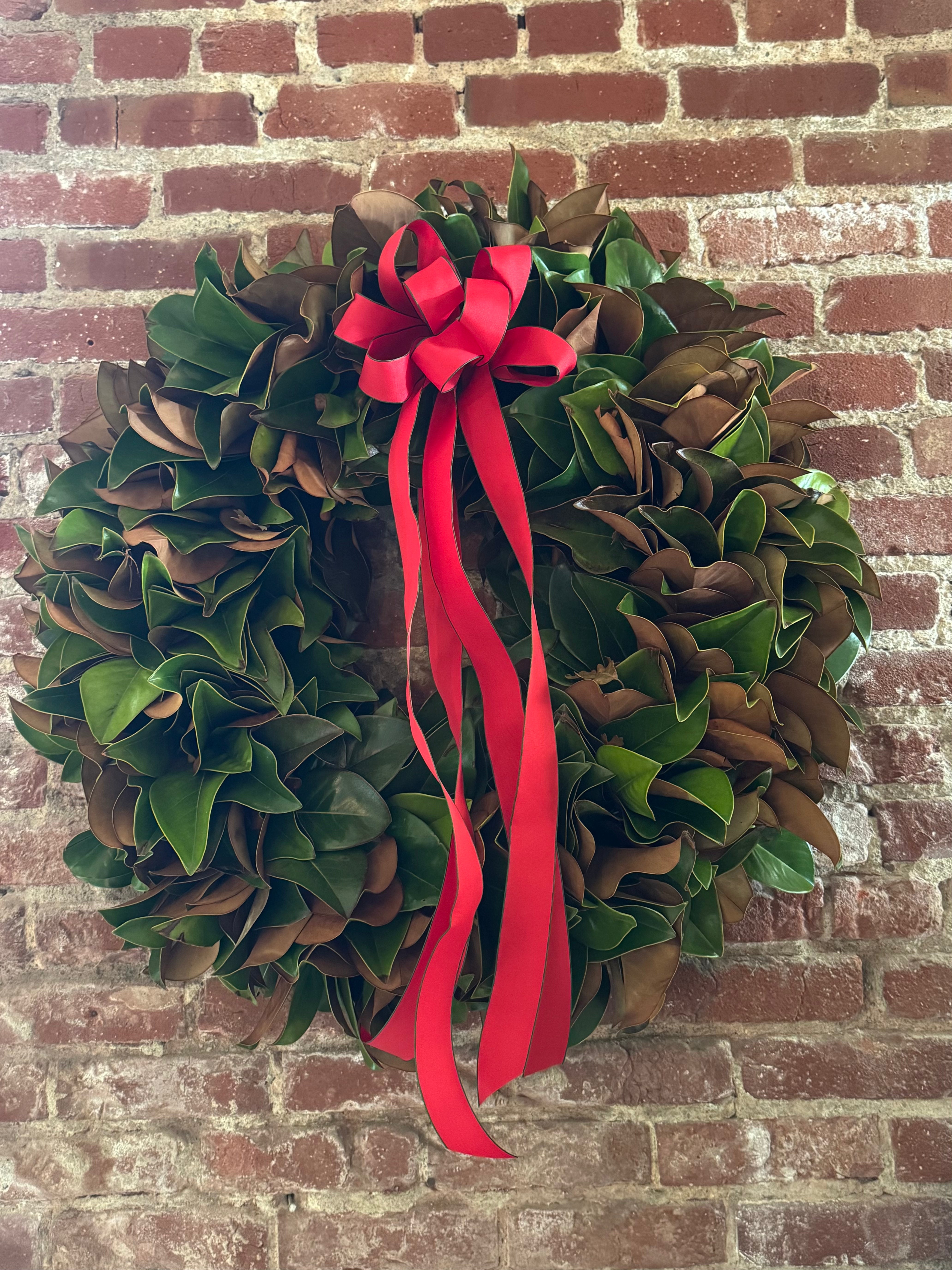 Magnolia Wreath — 30” Handcrafted by Le Jardinière Floral using magnolia leaves harvested from Fifth Street Farm. Naturally dried for lasting beauty, this 30” wreath adds warm, organic elegance to any door, wall, or mantel.