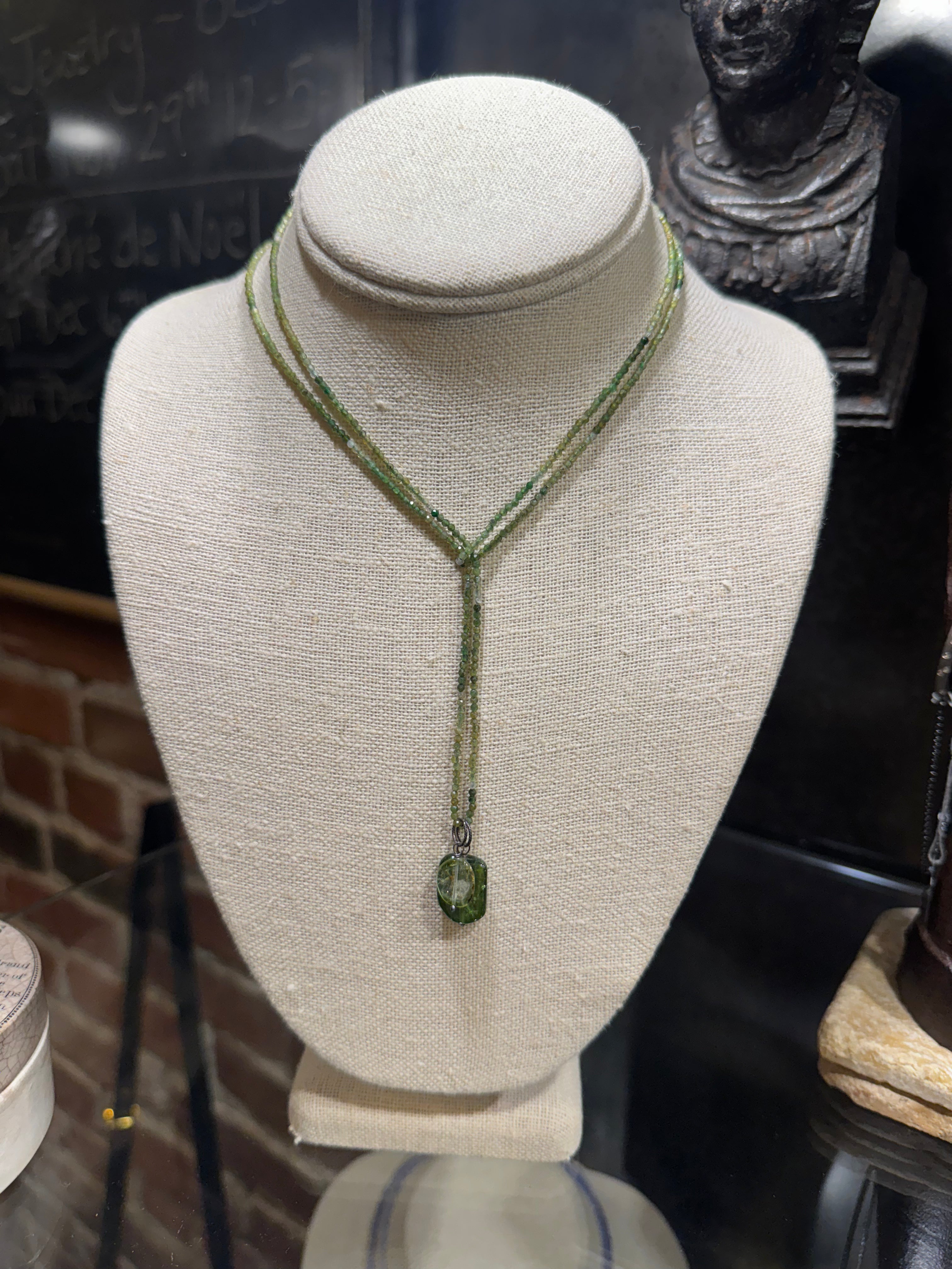 Delicate hand-strung faceted green tourmaline beads form an elegant lariat silhouette, finished with a polished green tourmaline pendant. A gorgeous everyday piece that layers beautifully or stands on its own.