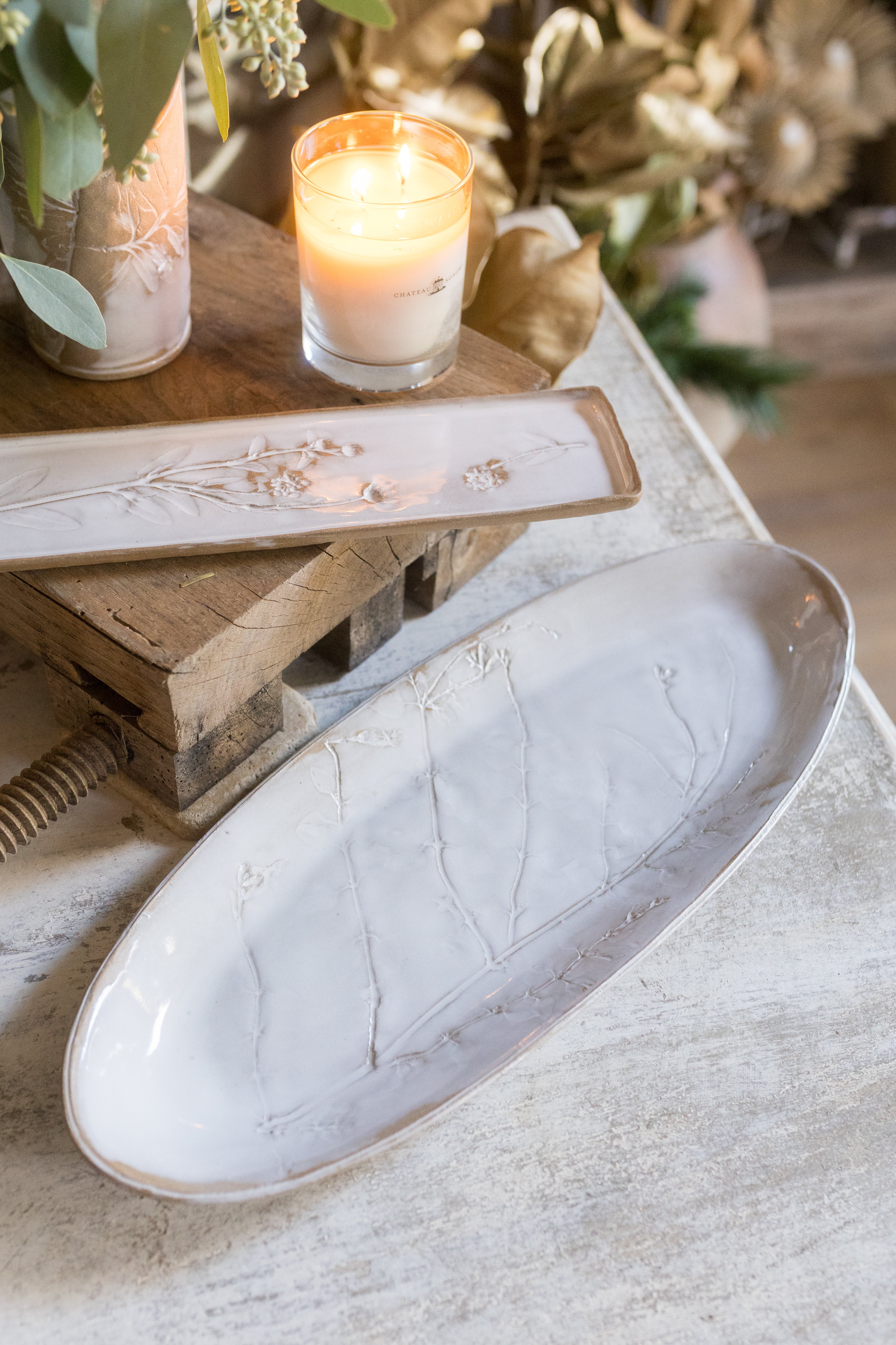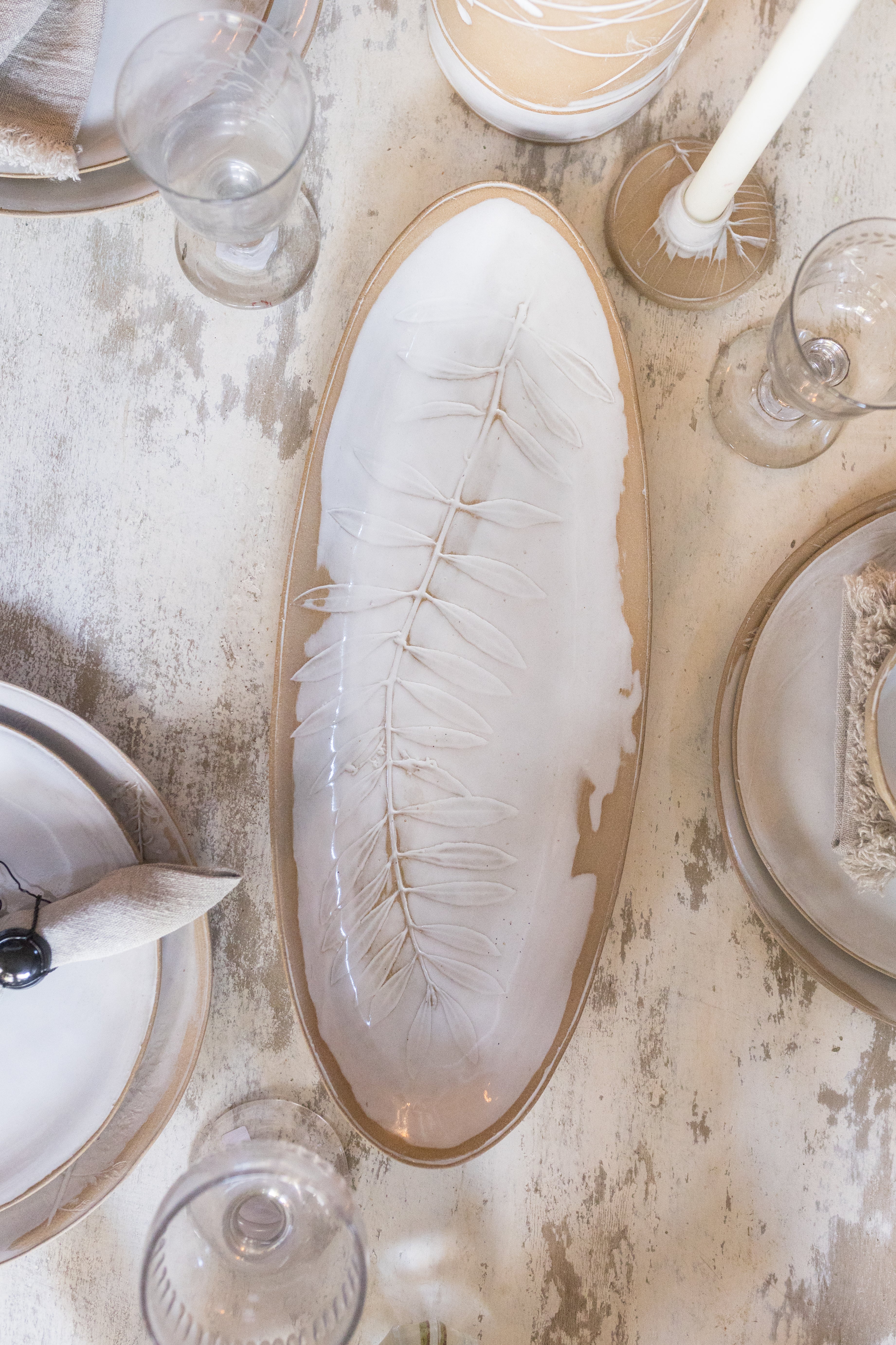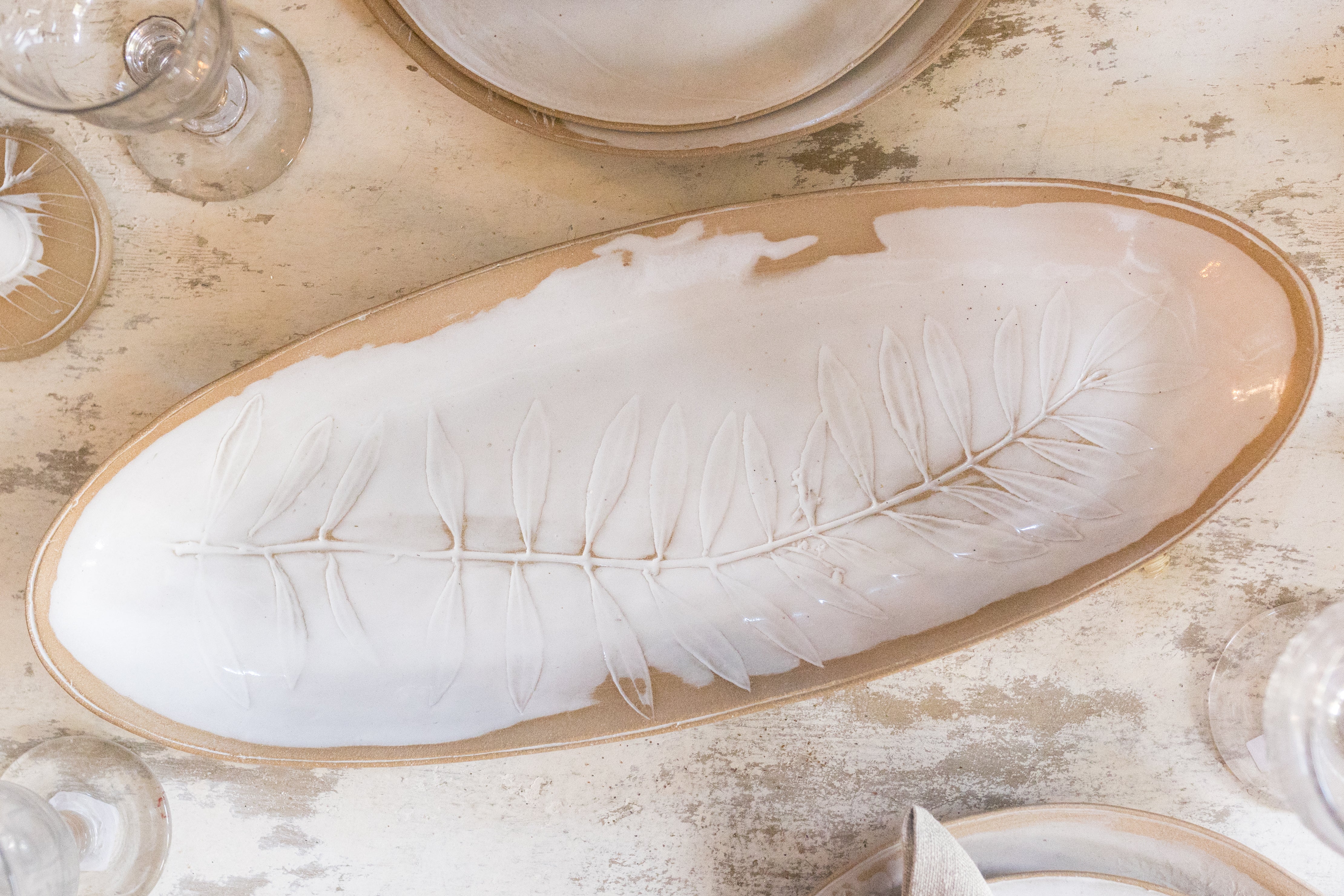 The botanicals are foraged at our 5th Street Farm, meticulously rolled into the clay and then fired two times in the kiln with the most gorgeous creamy glaze. Each piece is made by hand and one of a kind! It is part of our Chateau Sonoma Signature Dinnerware Collection. This is sure to elevate your dining experience and they are dishwasher safe.