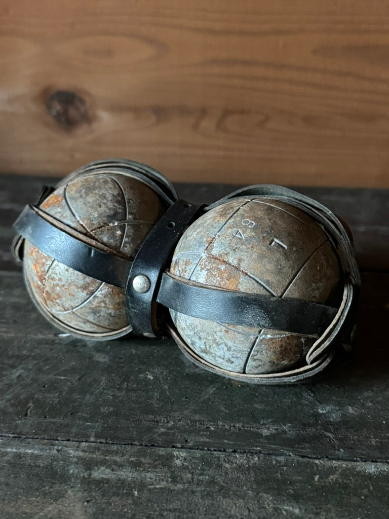 Vintage pétanque balls in a leather holder, a quintessential piece of French leisure culture. This charming set includes solid, well-worn pétanque balls housed in a beautifully aged leather case, perfect for display or as a nostalgic nod to the classic French pastime.