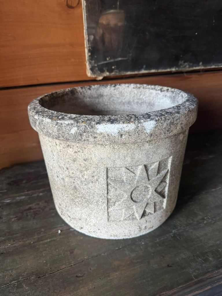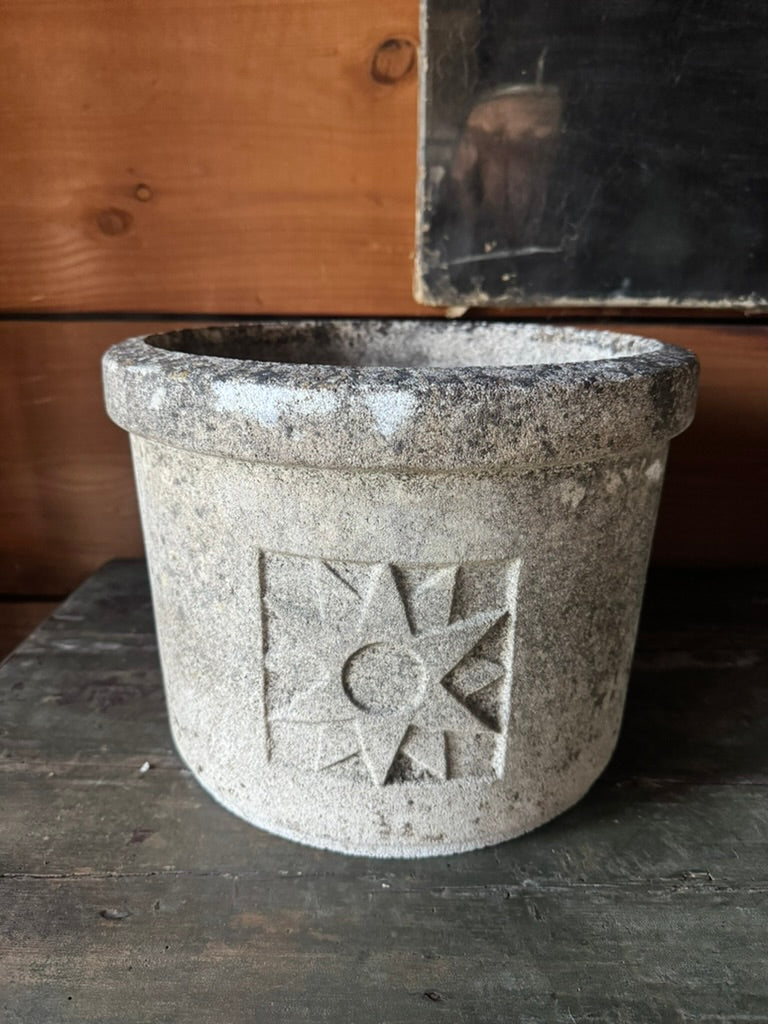 Add timeless French elegance to your space with this vintage cast stone planter. Its weathered patina and intricate motifs evoke the charm of a French countryside garden. Perfect for vibrant blooms or as a statement piece, this planter brings classic sophistication to any setting. This one has particular charm with its star motif.