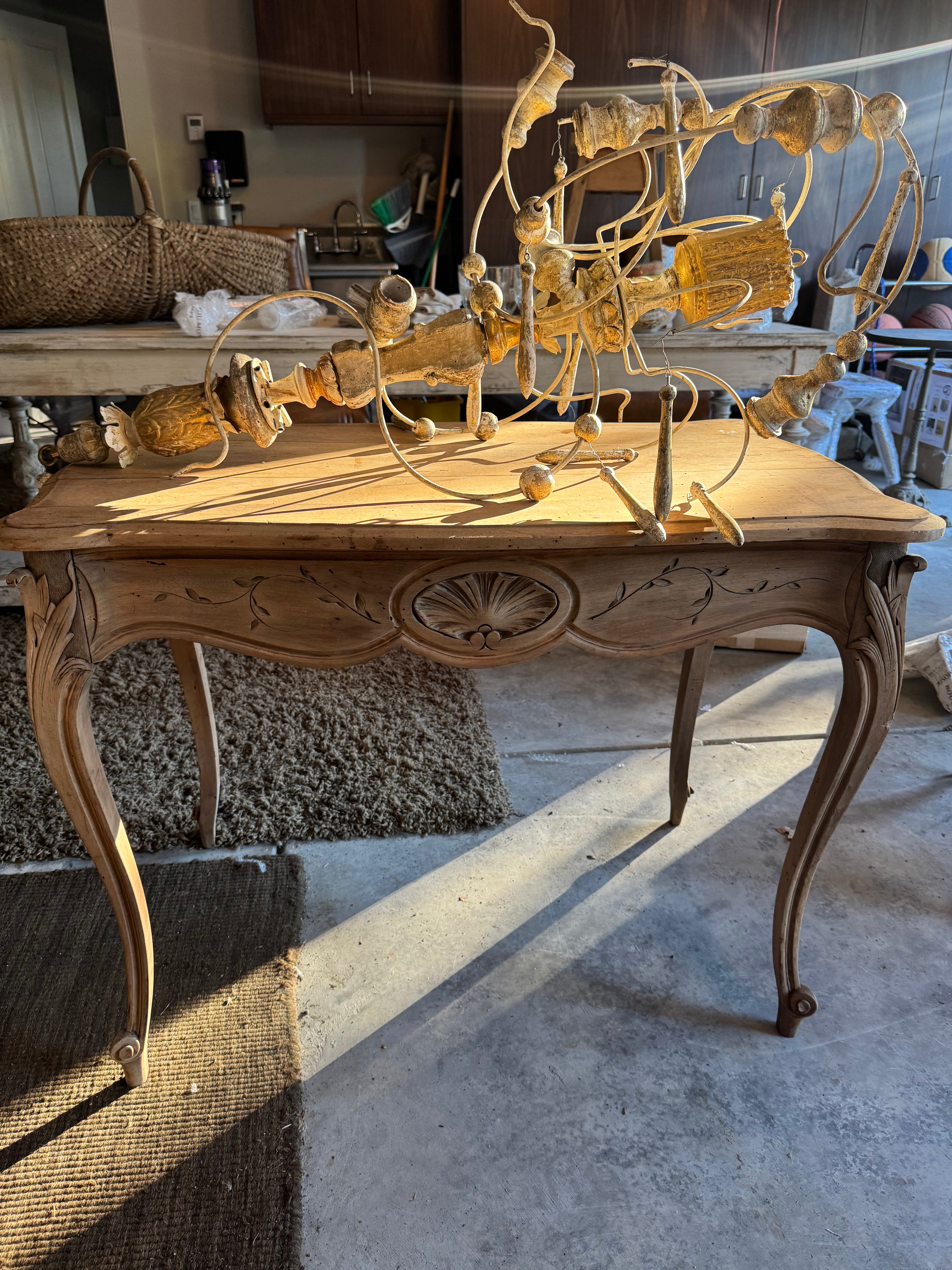 19th-century French side table with cared apron, cabriole legs, and a warm natural wood finish. Elegant, refines, and beautifully proportioned.